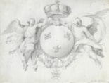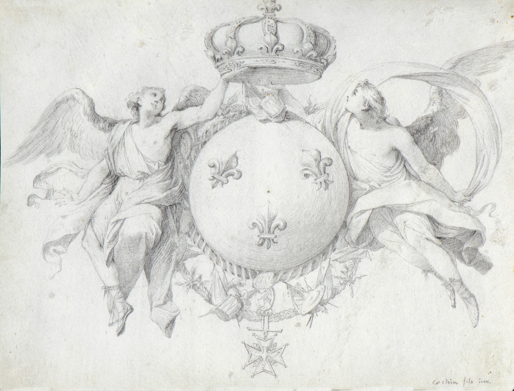 This small drawing on vellum is likely to have been a design for a frontispiece, vignette, title page or some other part of a book illustration. A number of similar drawings of the royal coats of arms are recorded in Charles-Antoine Jombert’s 1770 catalogue of Cochin’s work, such as two examples listed under the date 1739: ‘Petit fleuron pour le titre du livre, les armes du Roi sur un globe, soutenu par deux Anges, & environné de nuages.’ or ‘Le même Fleuron des Arms du Roi, gravé plus en grand par Cochin, pour in-8o: les figures y sont retournées de droite à gauche.’