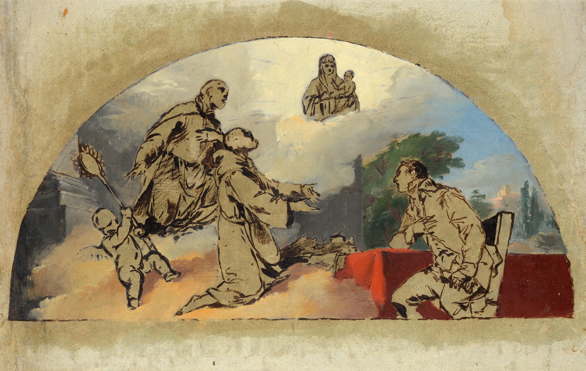 Despite the fact that Pietro Fancelli owed much of his success to his skill and inventiveness as a draughtsman, only a fairly small corpus of drawings by him survives, in which the combination of his Venetian training and Bolognese heritage can be seen. Although this drawing remains unrelated to any known work by the artist, its lunette shape is similar to that of another drawing by Fancelli; a study of La Beneficenca in the Schloss Fachsenfeld collection at the Staatsgalerie in Stuttgart. The Stuttgart drawing served as a design for a sephulcral monument, one of several that Fancelli produced, in the early years of the 19th century, for the newly built cemetery of the Certosa, just outside Bologna. Although somewhat unusual in composition, the present sheet may have also been intended for a similar purpose. A terminus ante quem for this large sheet is provided by the fact that it is drawn on the reverse of the cover of the Pinacoteca della Pontificia Accademia di Belli Arti in Bologna, published by Francesco Rosaspina in 1830.