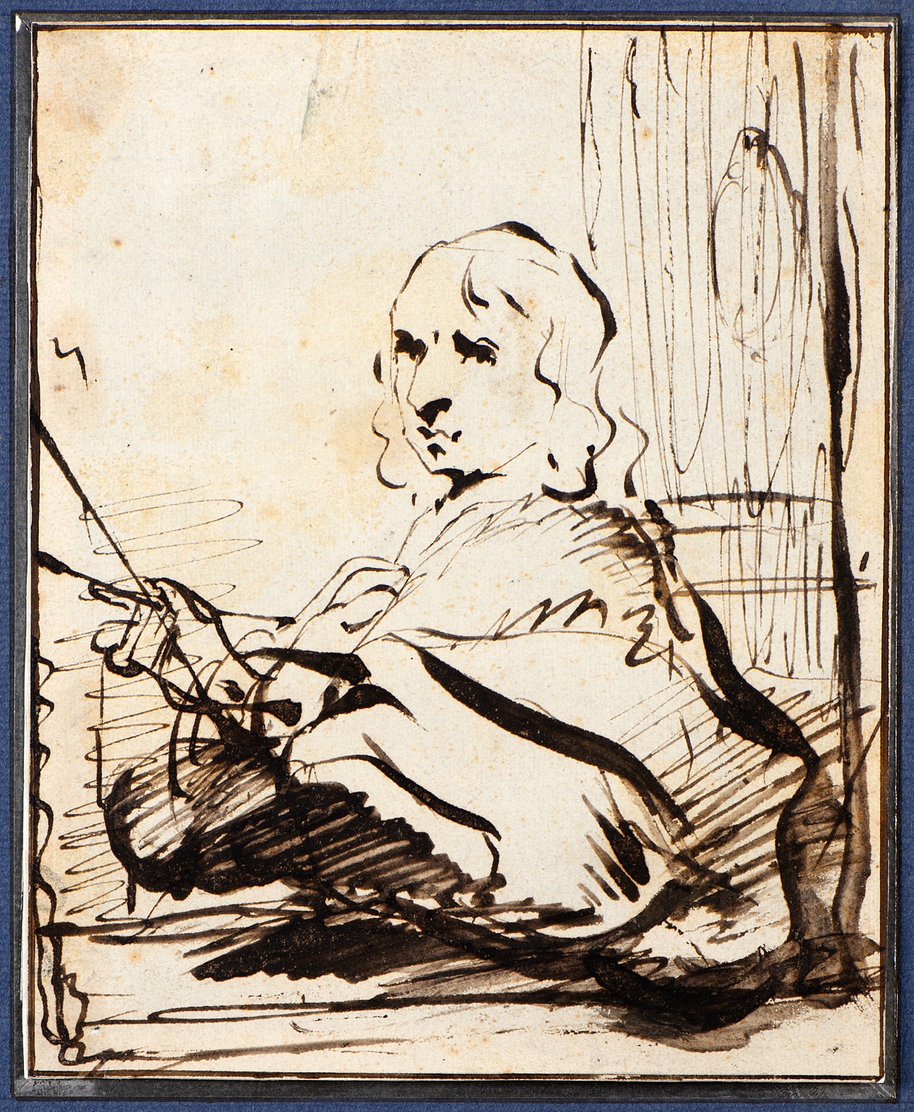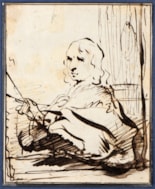 Only a handful of portrait drawings by Govert Flinck are known. Drawn with a quick and spontaneous pen line, the present sheet may be dated to the second half of the 1650s, and shows the influence on the artist of the pen drawings of Rembrandt. Among stylistically comparable pen and ink drawings by Flinck is a half-length study of an archer, in the collection of the Herzog Anton Ulrich-Museum in Braunschweig and a drawing of a Woman Seated at a Table in the Louvre. In his magisterial corpus of Flinck’s drawings, Werner Sumowksi further likens the present sheet to a signed and dated drawing of a Scholar in his Study of 1656, in the Heyblocq album amicorum in the collection of the Koninklijke Bibliotheek in The Hague, as well as to pen and ink drawings by Flinck of an Old Man Seated in the National Gallery of Victoria in Melbourne, a Standing Young Man with a Hat in the Louvre and a Young Man with a Staff in the Nasjonalgalleriet in Oslo.