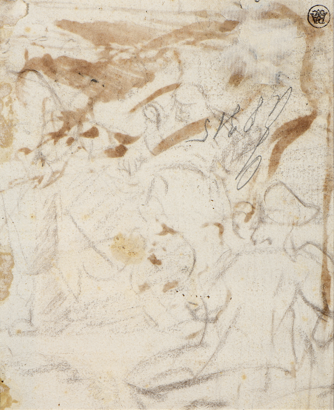 The very faint sketch in black chalk on the verso of the present sheet shows what appears to be a Biblical scene, which Sumowksi has suggested may represent Joseph’s Bloodstained Cloak Shown to Jacob or Potiphar’s Wife Accusing Joseph. If it is the former, then it may possibly be related to both a drawing of this subject, in the Musée Fabre in Montpellier, and a painting, dated 1655, which is today in the Sinebrychoff Art Museum of the Finnish National Gallery in Helsinki.
