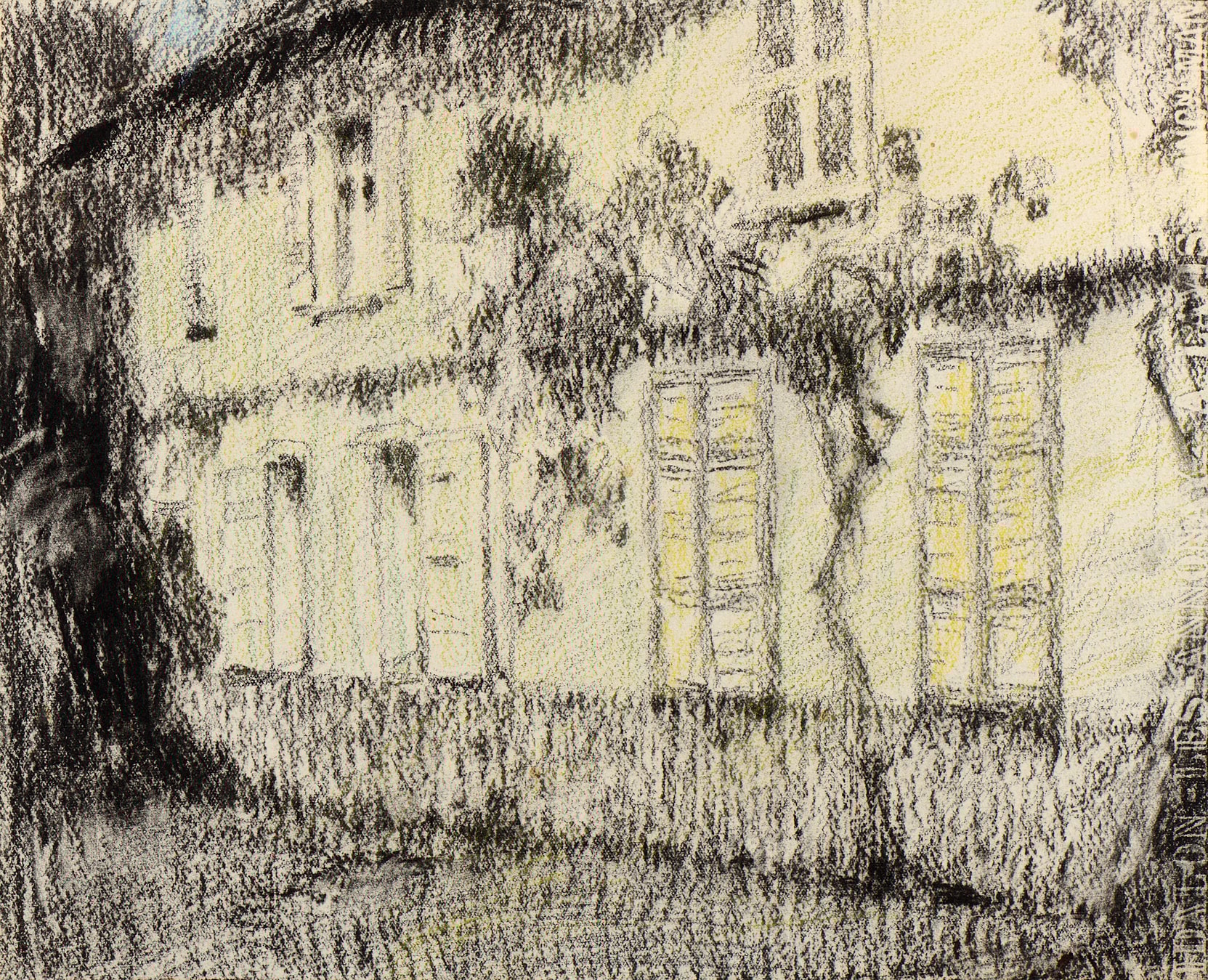 Drawn in 1933, the present sheet depicts one of Henri Le Sidaner’s favourite subjects; his house at Gerberoy, which he once described as his ‘haven of peace’. The artist often depicted the gardens and the façade of the house, studying the tonal effects and play of light at various times of day and in different seasons. Like most of his landscapes and town scenes, however, these views of the house at Gerberoy are almost always devoid of figures. As the painter Paul Signac noted of Le Sidaner, ‘his entire work is influenced by a taste for tender, soft and silent atmospheres. Gradually, he even went so far as to eliminate from his paintings all human figures, as if he feared that the slightest human form might disturb their ruffled silence.’