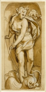 Depicting the sea nymph Galatea riding on a shell drawn by dolphins, this is a fine and typical example of Paolo Farinati’s distinctive draughtsmanship. The placement of the figure in a niche would suggest that the drawing was intended to prepare a painted mural decoration in a palace or villa; one such example - a detached fresco by Farinati of a female mythological figure in a niche – is in the Museo Civico in Verona. A large drawing by Farinati of this sort of wall decoration, with a mythological figure in a niche flanked by herms and a frescoed landscape, was recently acquired from a private collection by the British Museum.