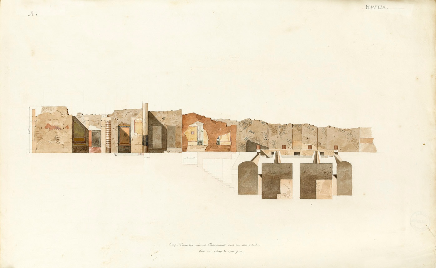 Inscribed A. and POMPEIA at the top of the sheet and Coupe d’une des maisons Championnet dans son etat actuel. / Sur une echelle de 0,010 p.m. at the bottom of the sheet.