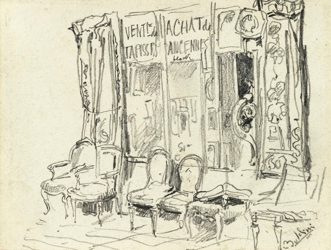 Boldini was a gifted and somewhat compulsive draughtsman, and filled many sketchbooks with drawings. (He would also use whatever paper came to hand, and there are examples of quick sketches drawn on menu covers, receipts, ledger paper, postcards, hotel stationery, pages torn from auction catalogues, and so forth.) His drawings, characterized by a restless energy and a spirited technique wholly in keeping with the bravura brushwork of his oil paintings, range from quick sketches of figures, landscapes, buildings and objects to more elaborate studies of these same motifs. As Richard Kendall has recently written, ‘Evident in almost all of [Boldini’s drawings] is a vivid engagement with the pleasures of looking and with the nervous exuberance of the drawing process, irrespective of the chosen subject…Some of these drawings would have taken only minutes or even seconds to complete, while others are the work of hours of concentrated labor…This engagement was vividly physical and sensuous, as his hand erupted in wild flourishes of pencil, pen and ink, crayon, and charcoal, or opted for extreme delicacy as the situation demanded.’ The largest surviving group of drawings by Boldini, bequeathed by the artist’s widow, is today in the collection of the Museo Boldini in Ferrara.
