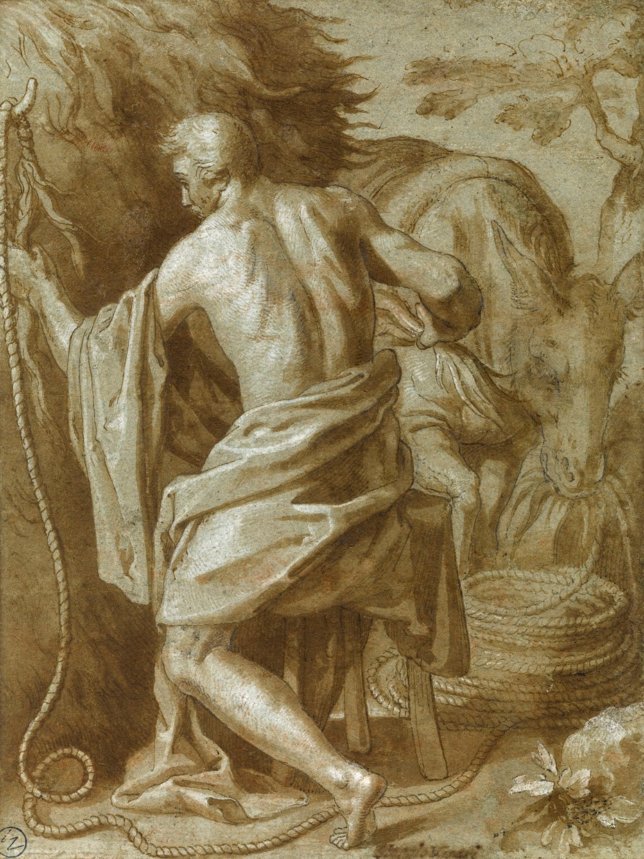 In its use of blue paper and its stylistic relationship with late 16th century Veronese and Venetian draughtsmanship, the present sheet may tentatively be dated to the early part of Jacopo Ligozzi’s career, while he was working in Verona or shortly after his arrival in Florence in 1577. Jennifer Montagu has pointed out that the unusual subject of this drawing derives from an ancient Greek painting by Polygnotus of the mythological character of Ocnus (or Oknos); a figure symbolic of futility, or unending labour. Ocnus was condemned to spend eternity weaving a rope of straw which, in turn, was eaten by a donkey almost as fast as it is made. As Montagu notes, Ocnus ‘had an extravagant wife who spent everything he earned by his labours; he is represented as a man twisting a cord, which an ass standing by eats as soon as he makes it, whence the proverb ‘the cord of Ocnus’ often applied to a labour which meets no return, and is totally lost.’ This unusual subject is extremely rare in 16th or 17th century Italian art.