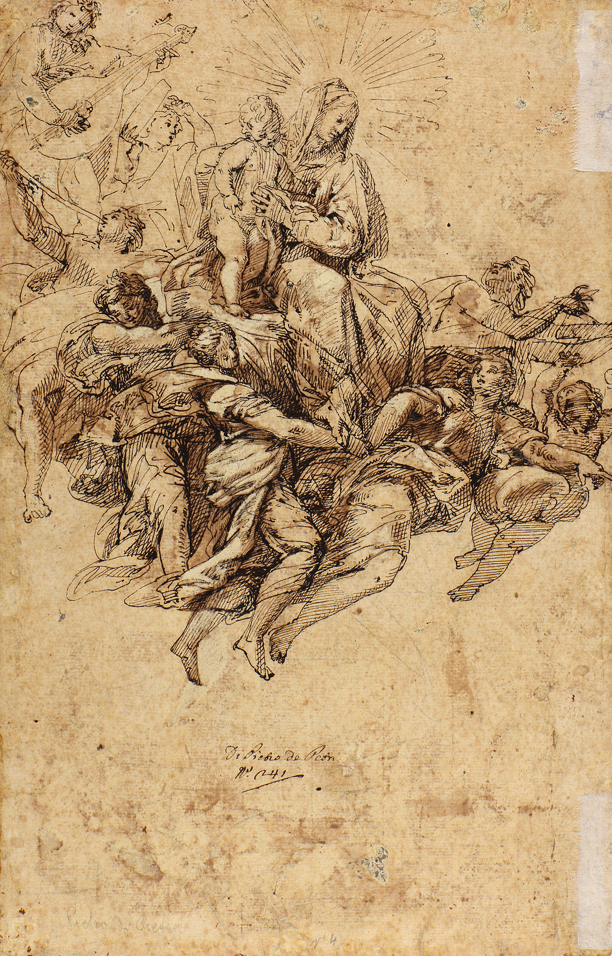 This large, double-sided drawing, which may be counted among the finest examples of Pietro de’ Pietri’s draughtsmnship, is a study for a now-lost painting of The Madonna of Loreto. Although the finished work no longer survives, a number of preparatory studies for the picture are known. An oil sketch is in the collection of the Museum Kunstpalast in Düsseldorf, as is a preparatory study in pen and brown ink and wash, while further studies for The Madonna of Loreto are found on both sides of a double-sided sheet in the Louvre. As Dieter Graf has noted of these preparatory drawings by Pietro de’ Pietri, to which the present sheet may now be added, ‘Apparently, the artist drew the sheets in quick succession, deftly varying the poses of the figures and details of the building from one sketch to another.’ The present sheet is the largest and most finished of the handful of extant pen studies for this lost painting by Pietro de’ Pietri.