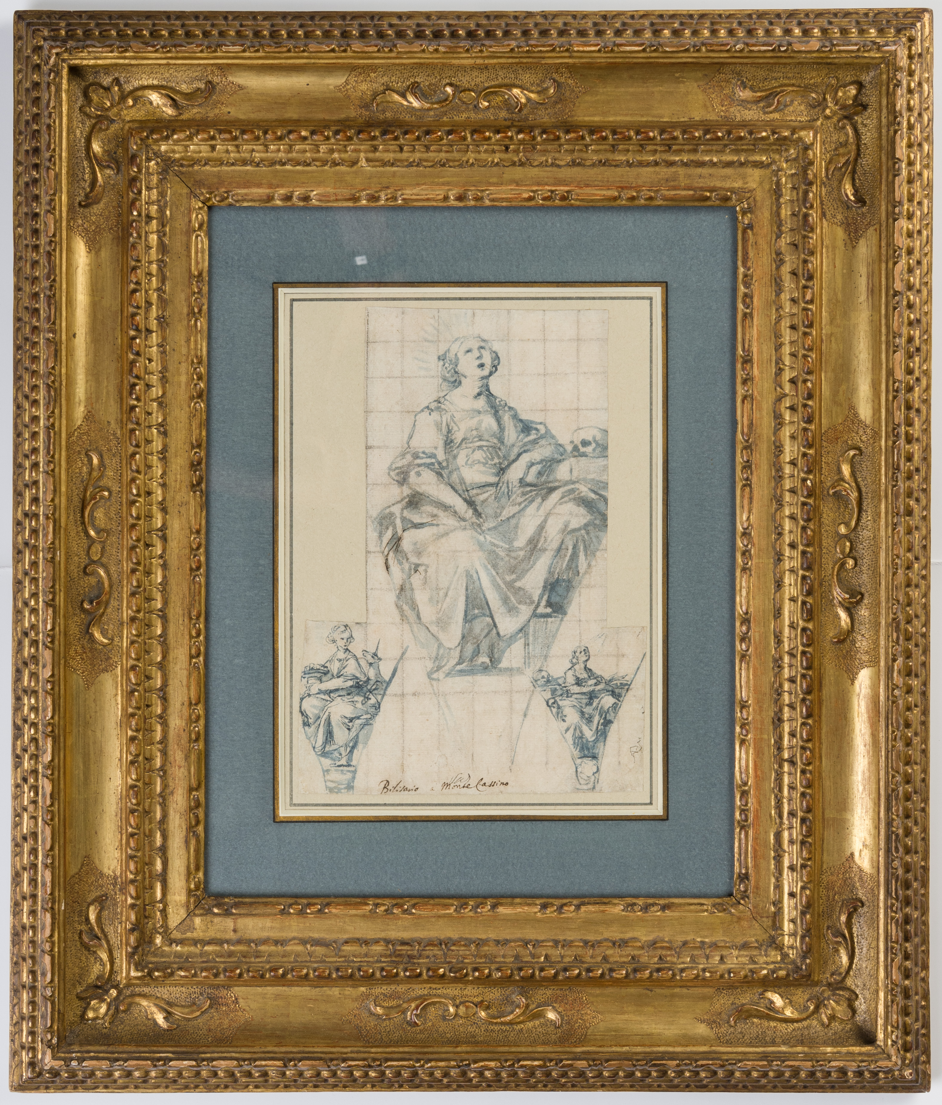 As the old inscription at the bottom of the sheet notes, this drawing comprises preliminary studies for Corenzio’s frescoes in the dome of the Benedictine abbey at Monte Cassino, painted between 1625 and 1629 but destroyed in 1944, during the Second World War. The cupola of the dome was frescoed with a scene of The Glory of Saint Benedict, while the pendentives below were occupied by female representations of the four virtues required for monastic life, namely Poverty, Chastity, Contemplation and Obedience. The main figure in the present sheet would appear to be a study for Contemplation, with an alternative design for the same figure at the lower right, while at the lower left is a study for a figure of Chastity.