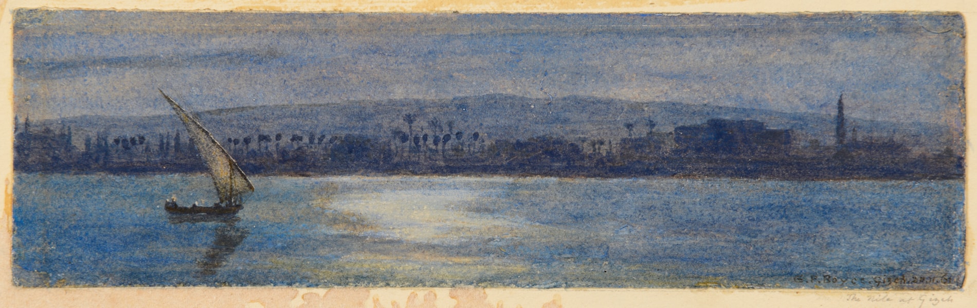 Further inscribed, signed and dated The Nile at Gizeh, from window of Fadel Pasha’s house / by moonlight / George P Boyce. Novr. 20, 1861. on the backing sheet.