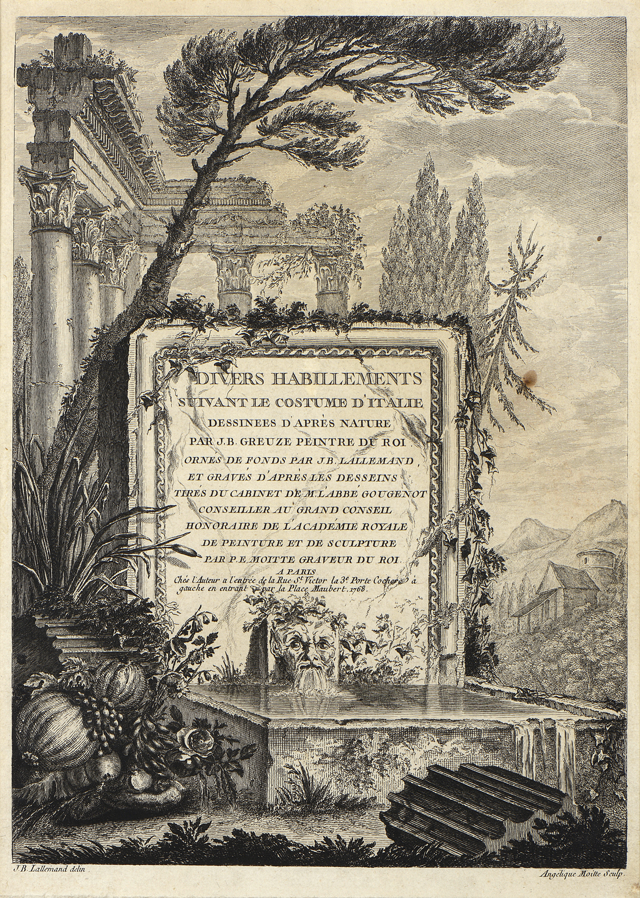This is a preparatory design by Jean-Baptiste Lallemand, with significant differences, for the frontispiece of the print series Divers Habillements suivant le costume d'Italie. Dessinees d’apres Nature par J. B. Greuze Peintre du Roi, Ornés de Fonds par J. B. Lallemand et gravés d'après les Desseins tirés du Cabinet de M. l'Abbe Gougenot, etc. par P. E. Moitte, graveur du Roi, Paris 1768. The series was made up of prints after watercolours by Jean-Baptiste Greuze of the colourful costumes of women of the Italian provinces. For the prints, Lallemand added elaborate backgrounds to each of Greuze’s costume studies, all of which – with the exception of the title page, which was engraved by Lallemand himself – were engraved by Pierre-Etienne Moitte and published in 1768.