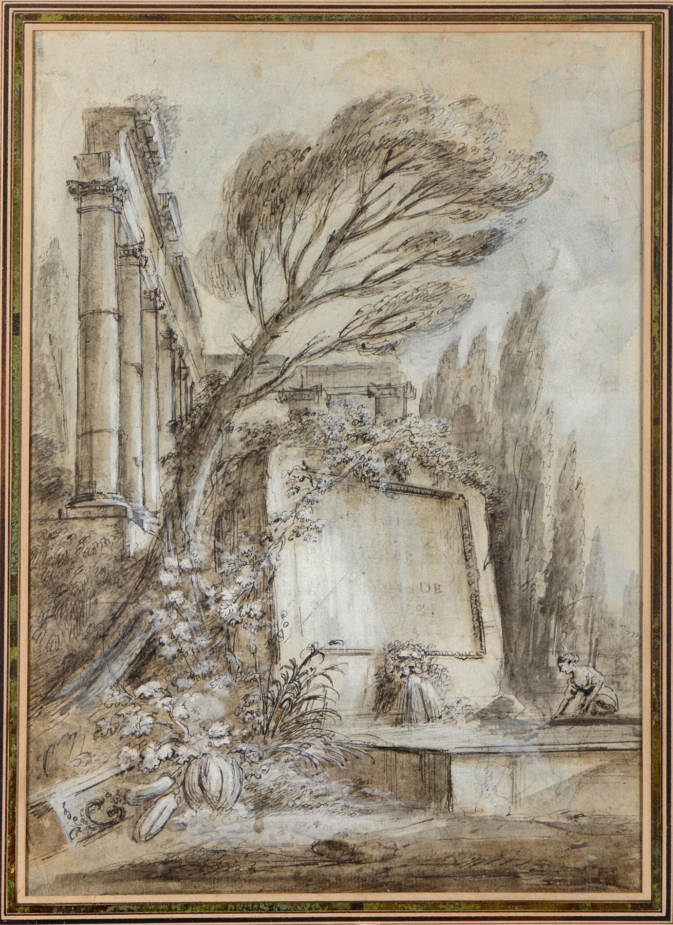 This is a preparatory design by Jean-Baptiste Lallemand, with significant differences, for the frontispiece of the print series Divers Habillements suivant le costume d'Italie. Dessinees d’apres Nature par J. B. Greuze Peintre du Roi, Ornés de Fonds par J. B. Lallemand et gravés d'après les Desseins tirés du Cabinet de M. l'Abbe Gougenot, etc. par P. E. Moitte, graveur du Roi, Paris 1768. The series was made up of prints after watercolours by Jean-Baptiste Greuze of the colourful costumes of women of the Italian provinces. For the prints, Lallemand added elaborate backgrounds to each of Greuze’s costume studies, all of which – with the exception of the title page, which was engraved by Lallemand himself – were engraved by Pierre-Etienne Moitte and published in 1768.
