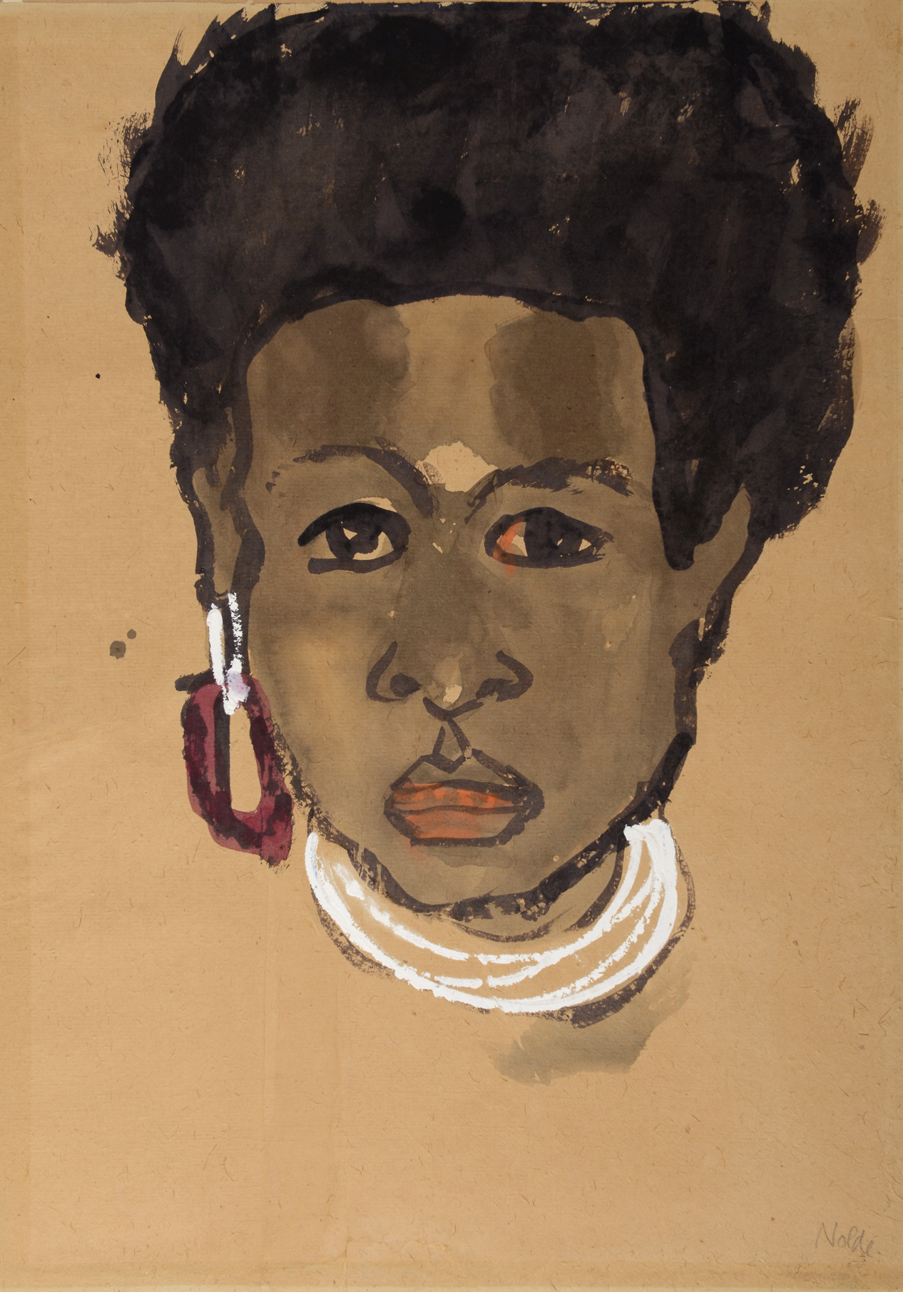The watercolour portraits and head studies that Nolde produced in New Guinea are invariably frontal images that are direct and reflect the artist’s personal encounter with the subject. Nolde’s autobiographical recollections of his time in New Guinea show how closely he studied the inhabitants, and recorded their appearance: ‘The other natives put white paint onto their foreheads as a sign of mourning. At dances they covered their bodies with light-coloured dots and lines, sometimes also blue. They rubbed lime into their hair to rid it of bugs, which made it a curious brown or rather brownish-red. All that made their appearance even more interesting.’