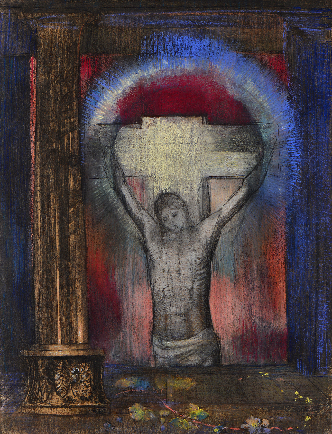 Among the handful of pastel drawings of Christ on the Cross by Redon is a large example, showing just the head and upper torso of Christ, in the Koninklijk Museum voor Schone Kunsten in Antwerp and a Crucifixion in the E. G. Bührle Collection in Zurich, as well as another, smaller pastel sold at auction in London in 1989.