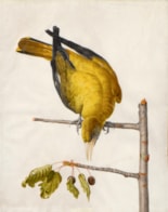 Beautifully drawn in watercolour or gouache on fine vellum, studies of birds such as this are likely to have been produced as independent works of art for sale to collectors. When painting these highly finished studies of individual birds, Karl Wilhelm de Hamilton chose to depict them standing on a single bare twig or branch, and isolated against a blank background. Two comparable studies of birds on branches by the artist, depicting a finch and a tit and each also drawn on vellum, were sold at auction in London on 2001, while also very similar in style, technique and composition is a gouache drawing of a bullfinch on a gooseberry branch, which appeared at auction in Paris in 2004 and 2012.