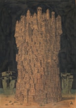 Drawn in 1956, this among the largest works on paper by Domenico Gnoli, and dates to the period when he had chosen to abandon working for the theatre, claiming that ‘it was distracting [him] from the essential’, in order to devote himself to drawing. A close stylistic comparison may be made with a much smaller ink drawing of an Imaginary City of 1956, sold at auction in 2006. Also comparable in technique and conception is an equally large pen and ink drawing, also of the same year as the present sheet, entitled The Ship of Emigrants (La nave degli emigranti), which was formerly in the collection of Frédéric Dard in Geneva, as well as a drawing entitled City of 1957, depicting an imaginary city resting on top of a table, which was in a private collection in Bath in 1985.