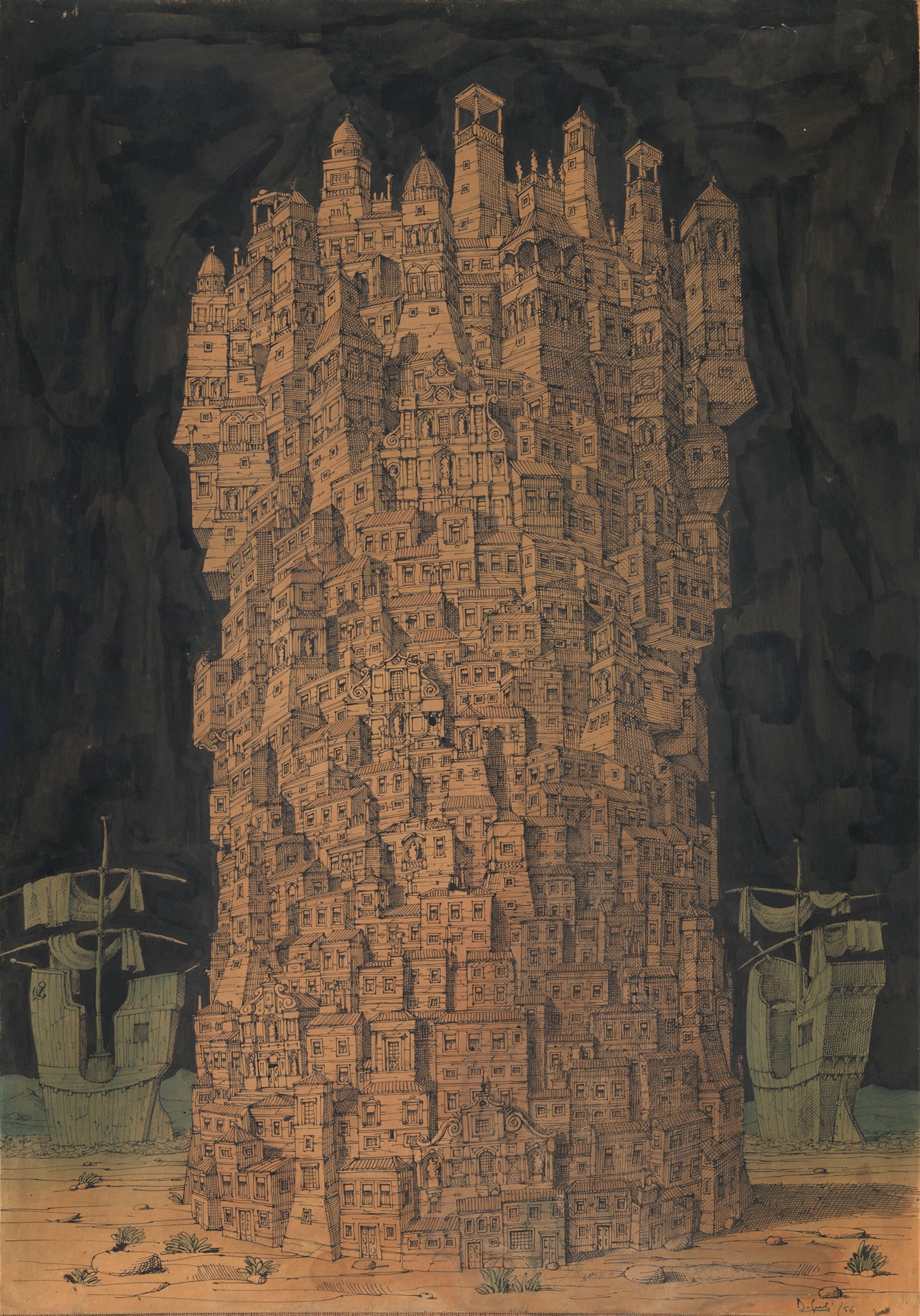 A Times review of an exhibition of drawings by Gnoli at the Arthur Jeffress Gallery in London in 1957, in which the present sheet may have been included, noted that ‘Mr. Gnoli’s drawings are complex, fantasticated, and full of busy goings-on of a mildly satirical absurdity – the general effect seems compounded of Babel and the Ship of Pools [sic]. Some of the most delightful are those in which he builds intricately crazy cities that tower up like insecure antheaps and bristle with activity...The success of imaginative excursions of this sort depends largely on the ability of the never-never land that has been created to sustain a measure of internal plausibility by which even the most extravagant oddities become, in context, the correct and acceptable thing. The world of Mr. Gnoli’s drawings may seem a largely synthetic and artificial one, but it does establish a sense of its own private logic by its exorbitant amount of quite rational detail. The impossible boats are all firmly built: one can count the nails. And though the tenement-blocks only stand up by the grace of architectural fiction, the construction of the innumerable doors, windows, stairways, and balconies of which they are composed appears eminently sound and reasonable.’