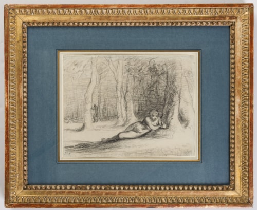 This fine drawing may be grouped with a relatively small number of early chalk drawings of female nudes, datable to the second half of the 1840s. As Alexandra Murphy has noted, ‘For an artist seeking to establish himself in the art circles of Paris, the nude was a perfect vehicle. It bespeaks both tradition and immediacy. If we see the exploration of timelessness as one of the many recurring themes in Millet’s oeuvre, then Millet’s female nude drawings, almost always without literary references or anecdotal accoutrements, fit this mold as easily as his scenes of peasants in Barbizon.’ Among stylistically comparable drawings of single female nudes of this date are several examples in the Louvre, including a study of a bather on blue-grey paper and another of a woman putting on her chemise, as well as a Reclining Nude in a private collection. The bucolic setting of this drawing, and the presence of a figure playing music in the background, give the composition an air of a scene from mythology or classical literature, although Millet allows no references to a specific theme.