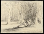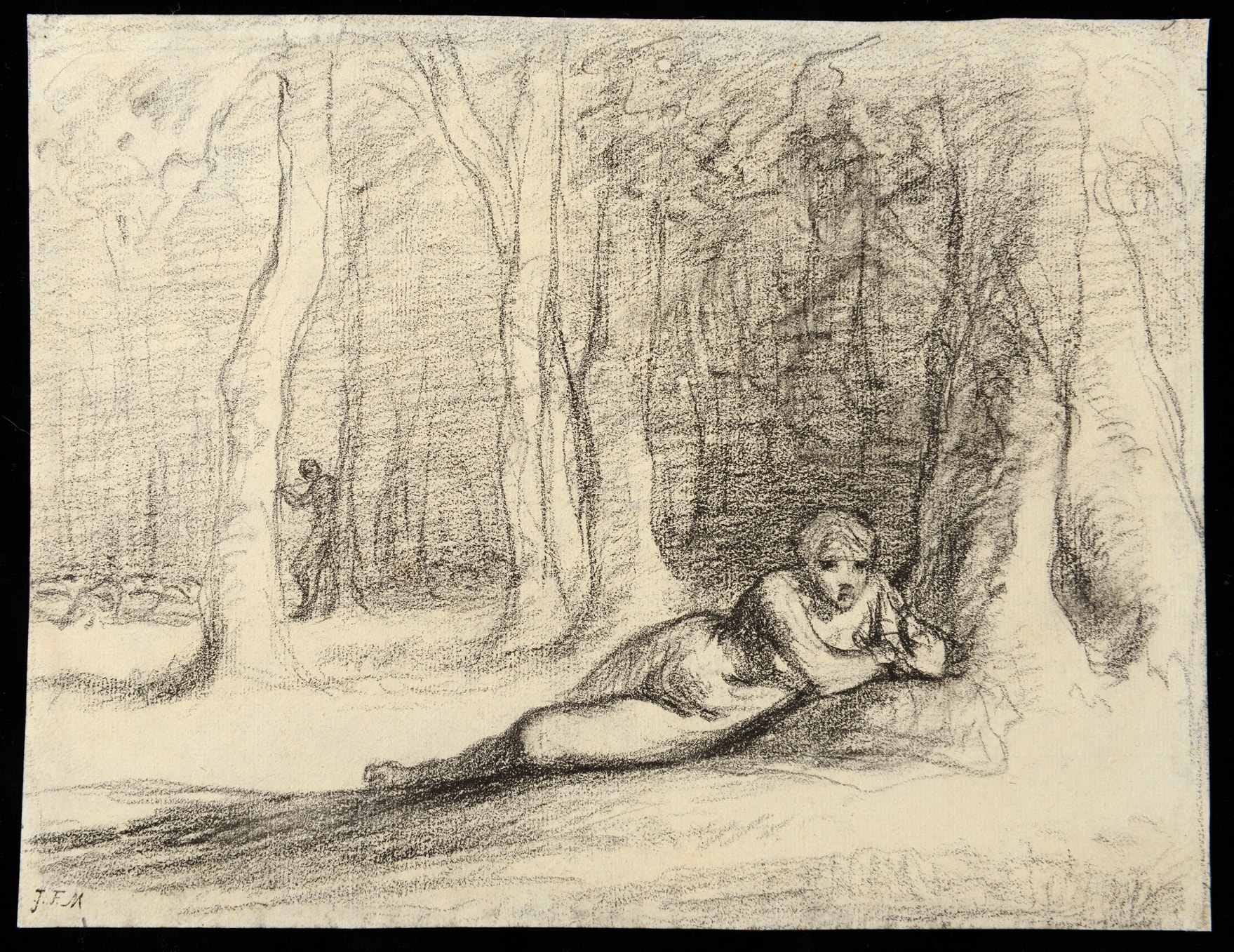 After his arrival in Paris in 1846, Jean-François Millet produced a series of paintings and drawings in which female nudes are prominent. Perhaps inspired by the work of Watteau, Fragonard and Boucher, he painted around twenty-five small-scale paintings of female nudes in bucolic settings, typified by such works as A Woman Reclining in a Landscape of c.1846-1847, in the Museum of Fine Arts in Boston. These paintings, sometimes mildly erotic in nature, seem to have been painted with a view to having more immediate commercial appeal than the larger works he was painting for the Salons. At the same time, Millet made around fifty drawings that can be related to this same trend, although they remain a very small part of his oeuvre as a draughtsman as a whole. By the end of the decade, Millet had turned his attention to peasant subjects, and such depictions of female nudes largely disappeared from his oeuvre for the remainder of his career.