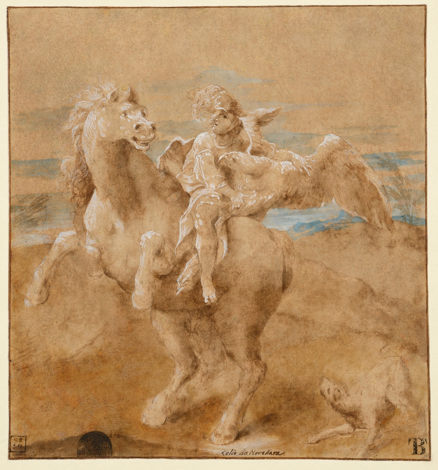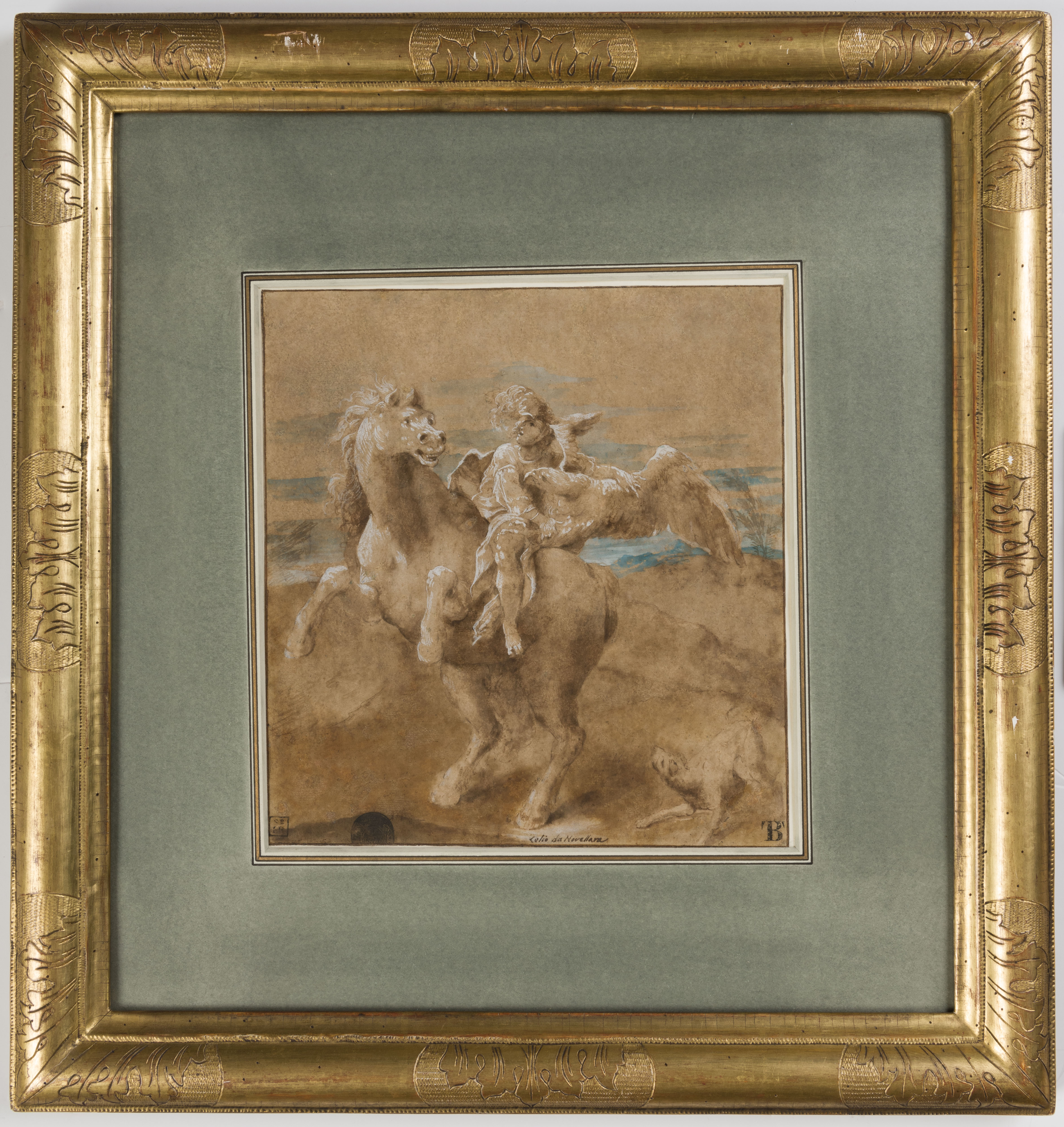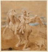 This highly finished drawing is a splendid example of Lelio Orsi’s fine technique as a draughtsman, typical both in the manner in which the highlights are applied and the distinctive facial types. The drawing is probably a study for a lost fresco which once decorated the facade of a house in Novellara that belonged to the Gentili family in the 17th century, and which was destroyed towards the end of the 18th century. The fresco was described in anonymous account of Lelio Orsi’s paintings in Novellara, written around the middle of the 17th century, as depicting Ganymede on a horse; an unusual and quite innovative treatment of the subject: ‘Above another house of the Gentili family, he painted a Ganymede on horseback, that is still preserved there, and is esteemed by all those who see it.’ The 19th century Novellara historian Vincenzo Davolio also mentions the lost fresco: ‘and we have seen, destroyed not many years ago, the last remnants of some shields depicting naval battles, the war of the Giants, a Ganymede on horseback, painted by Lelio on the facade of the old Gentili house.’
