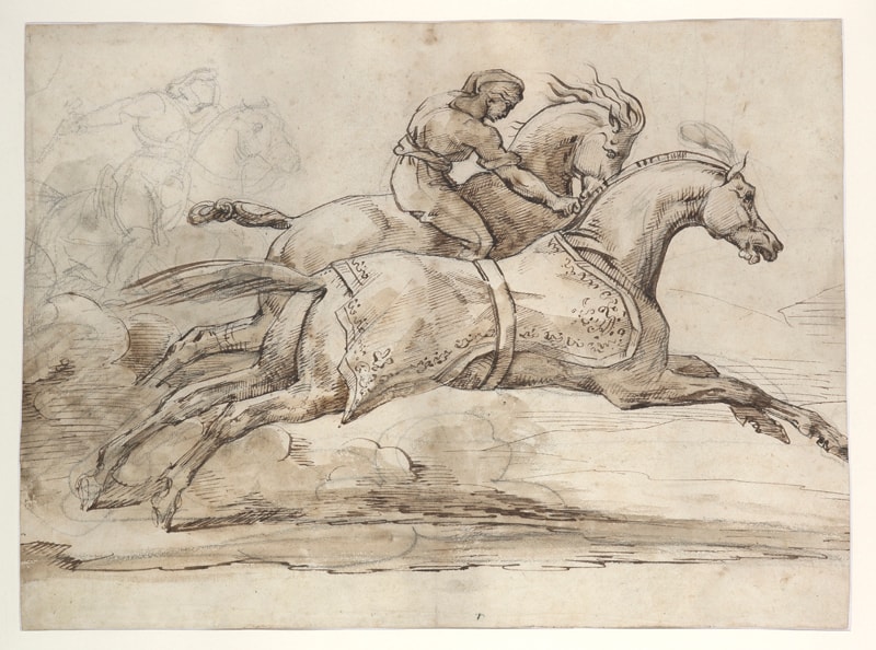 Géricault worked on a series of drawings and oil sketches on paper on the theme of the Race of the Barberi Horses for most of his time in Italy - a period of some seven months in all - culminating in a huge canvas, which measured some thirty feet in length. On his sudden return to France in September 1817, however, the painting was abandoned unfinished in his Roman studio, and no longer survives. Nevertheless, some idea of the genesis and development of the composition can be had from the approximately twenty oil sketches and sixty drawings related to the project which the artist brought back with him when he returned to Paris. As Charles Clément, Géricault’s early biographer and author of the first catalogue raisonné of his work, has noted, ‘The admirable drawings of the Race of the Riderless Horses which have survived are executed, in pen and ink for the most part, with details indicated very lightly with a few hatchings. One would be very wrong to regard these as improvisations, or mere sketches.’