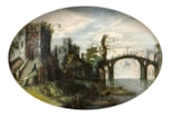 Jan van de Velde the Younger is much better known today for his landscape and portrait etchings and engravings than for his paintings, which are very few in number. The composition of this little copper is derived from the artist’s etching Landscape with Ruins from a series of eighteen etchings published in 1615 as 'Amoenissimae aliquot Regiunculae, et antiquorum monumentorum ruinae' (‘Some very pleasant places and ruins of antique monuments’). This youthful etching by the artist is, however, much more horizontal in format than this oval composition, and measures 120 x 317 mm.