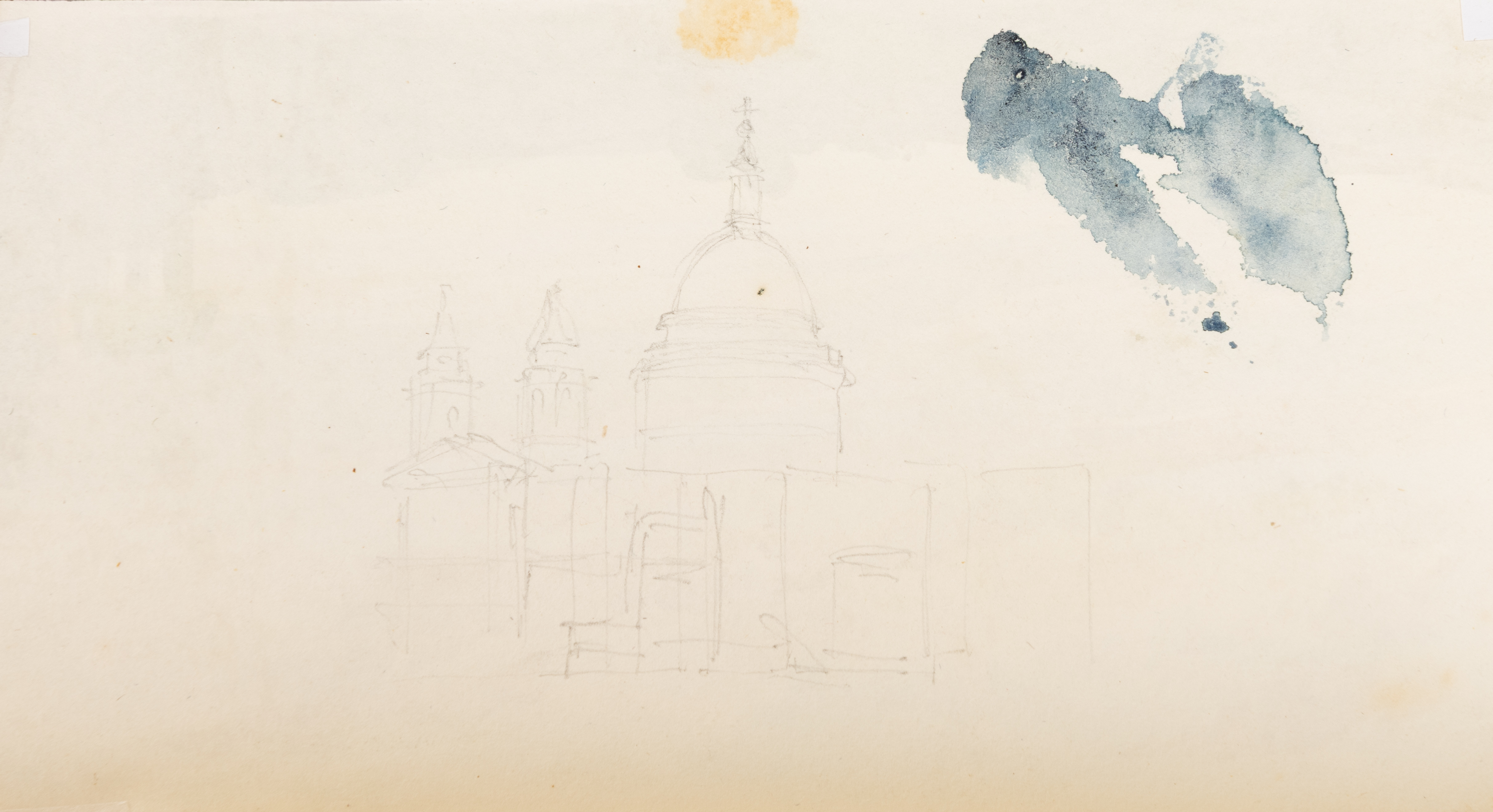 A sketch of a large church (St. Paul’s Cathedral, London?) in pencil on the verso.