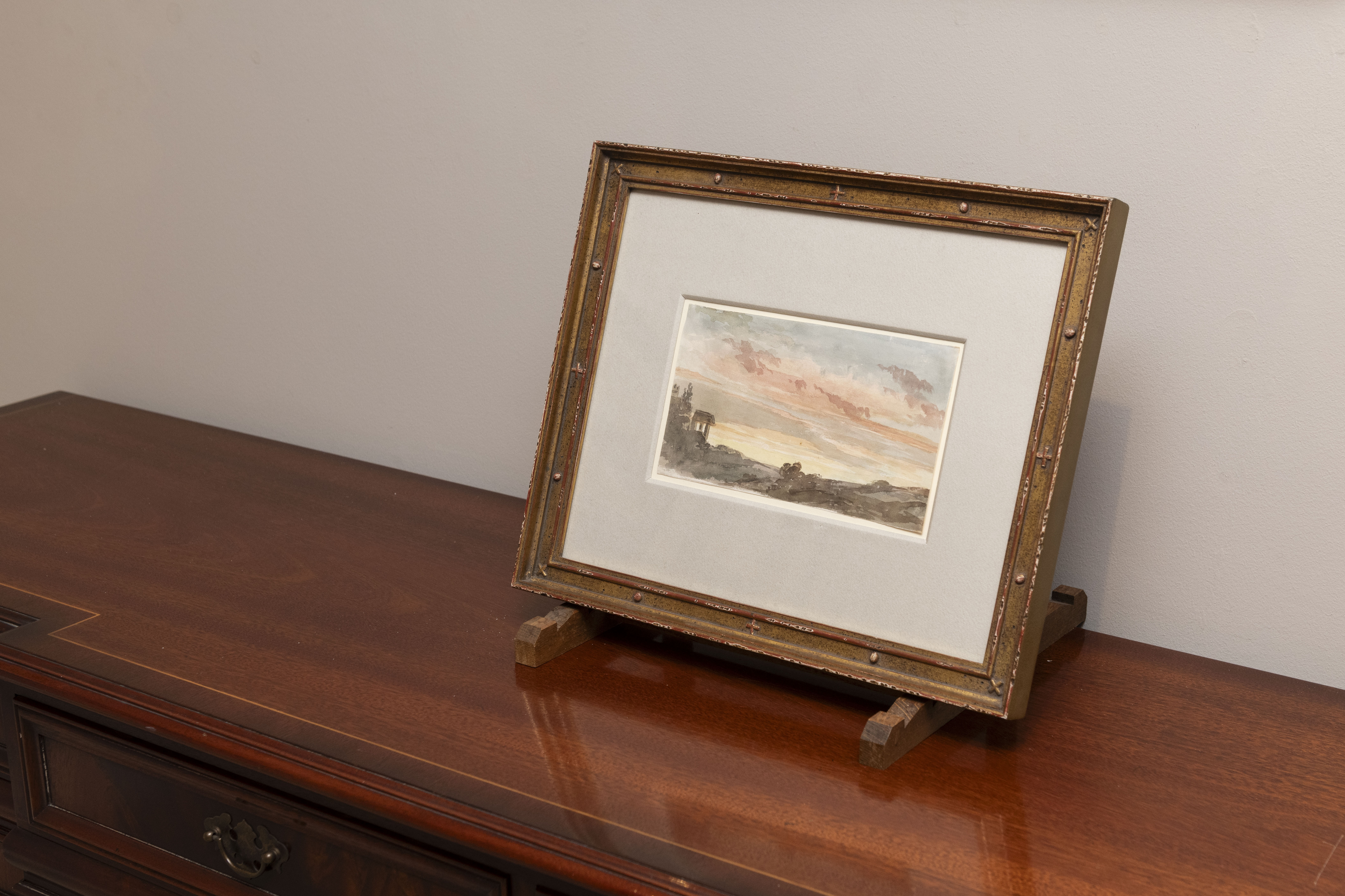 This was one of several landscape sketches by Joseph Gandy dating from the 1820s which were acquired from him by his friend, the Neoclassical sculptor Sir Richard Westmacott (1775-1856). Westmacott had studied in Rome with Gandy, and sometimes purchased works from his often impecunious friend. He later assembled these watercolours into two albums which he gave to his daughter Maria Poole. One of these albums is today in the Sir John Soane Museum in London, while the other album was eventually broken up and the drawings dispersed in 2004.