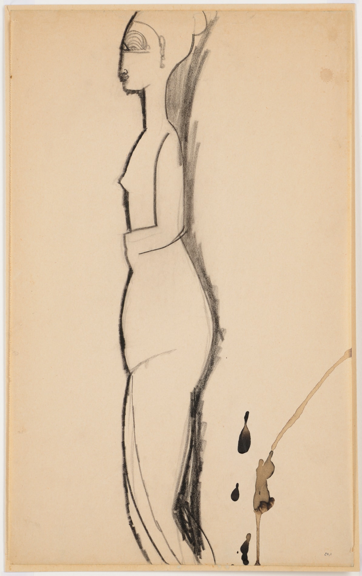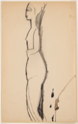 Drawn between 1910 and 1911, in the midst of the five-year period when Modigliani was working as a sculptor, this drawing can be related to the artist’s only full-length sculpture, the limestone Standing Nude of c.1912, today in the collection of the National Gallery of Australia in Canberra. The largest extant sculpture by Modigliani, the Standing Nude is characterized by ‘straight, narrow features and geometric forms [that] compete with sensuous curves in a long, narrow column which could have served as an architectural support or caryatid taking the place of a column or pillar. The folded arms are reminiscent of prehistoric figurines and Greek idols; the elaborate coiffure recalls Egyptian art; and there may be an echo of Cambodian or Khmer sculpture in the suggestion of earrings and a necklace.’
