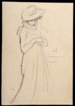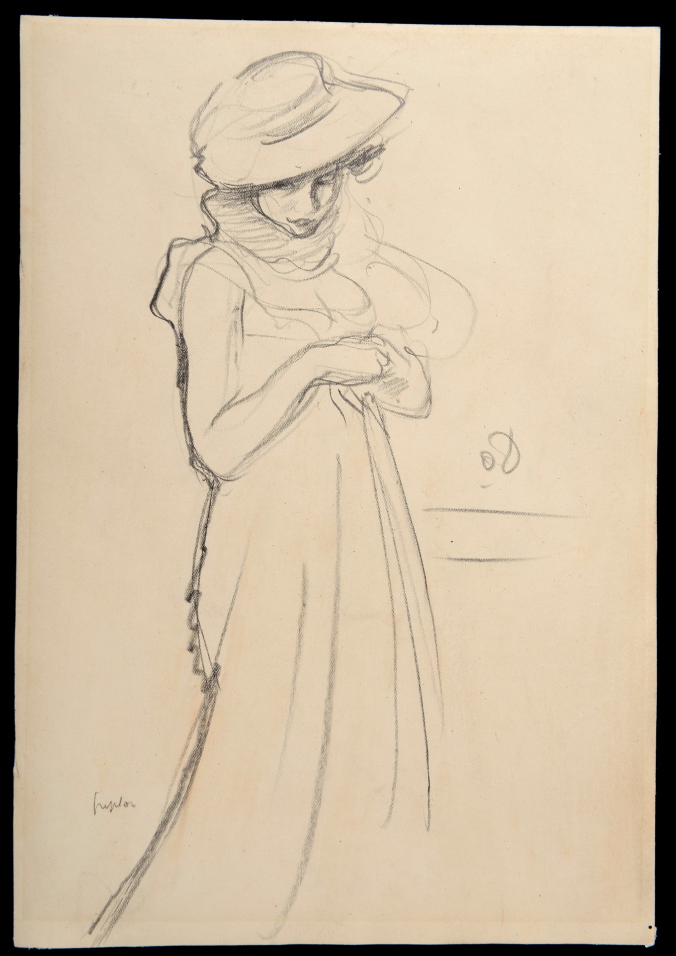 A closely related pencil drawing by Peploe, of similar dimensions, is in the collection of the Kelvingrove Art Gallery and Museum in Glasgow. Peggy Macrae also wears a similar wide-brimmed hat in Peploe’s painting The Yellow Dress of c.1910, in a private collection.