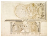The extensive architectural elements found in this large and impressive sheet would suggest that it is a mature work by Vittorio Maria Bigari. The wall scheme depicts two putti supporting a cartouche with a figure of Minerva as the personification of Wisdom, while above a separate sheet has been inserted into the composition, showing an allegorical female figure crowned by an angel. While it has not been possible to connect this drawing with any extant mural or ceiling decoration by the artist, the scale and complexity of the design suggests that it was an important commission.