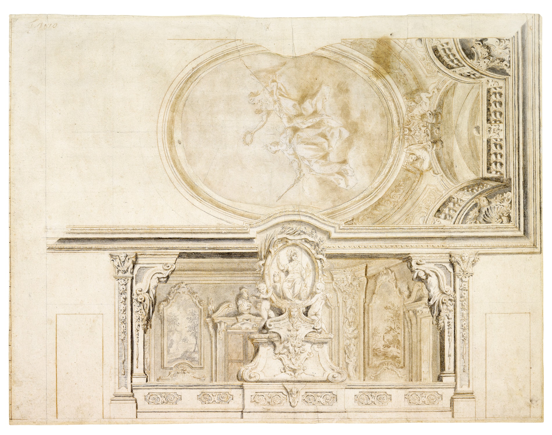 A ceiling study in pen and brown ink and wash on a separate sheet of paper laid down and inserted by the artist into the design at the top.