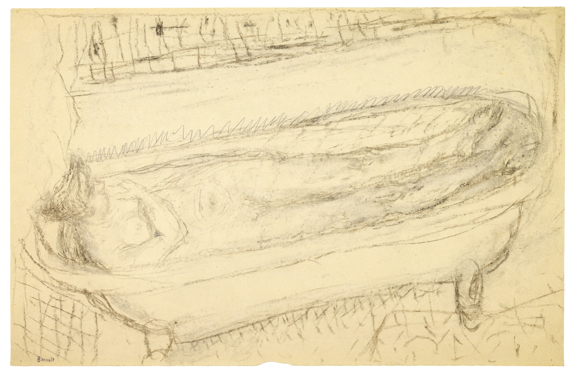 Bonnard’s obsessive treatment of the particular theme of a female nude floating in a bathtub - first seen in the painting The Bath of 1925, today in the collection of Tate Modern in London - was repeated in several paintings of the late 1930s and early 1940s, culminating in a Nude in a Bathtub and a Small Dog, begun in 1941 and completed five years later, in the Carnegie Museum of Art in Pittsburgh. The subject of Marthe immersed in a bath is also found in over twenty drawings in Bonnard’s sketchbooks and diaries from the 1920s onwards; one of these, a pencil drawing from one of the artist’s small sketchbooks, is particularly close to the composition of the present sheet, and must have preceded it.