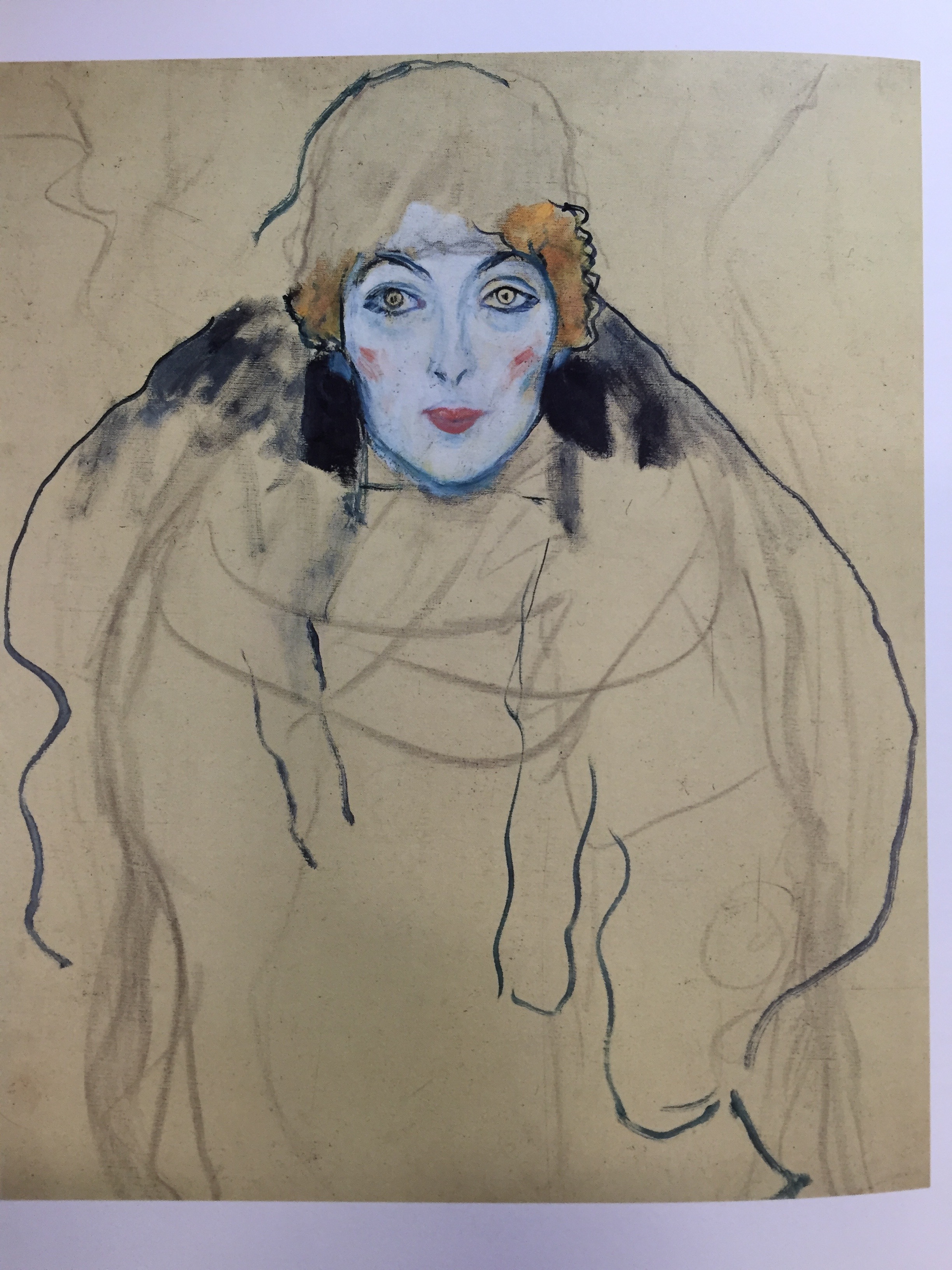 This large drawing is closely related to an unfinished, bust-length oil portrait by Gustav Klimt of an unknown woman [see comparative image], painted around 1917-1918, towards the end of the artist’s life. One of several incomplete canvases found in Klimt’s studio at the time of his sudden death in February 1918, the painting is today in the collection of the Lentos Kunstmuseum in Linz, Austria.
