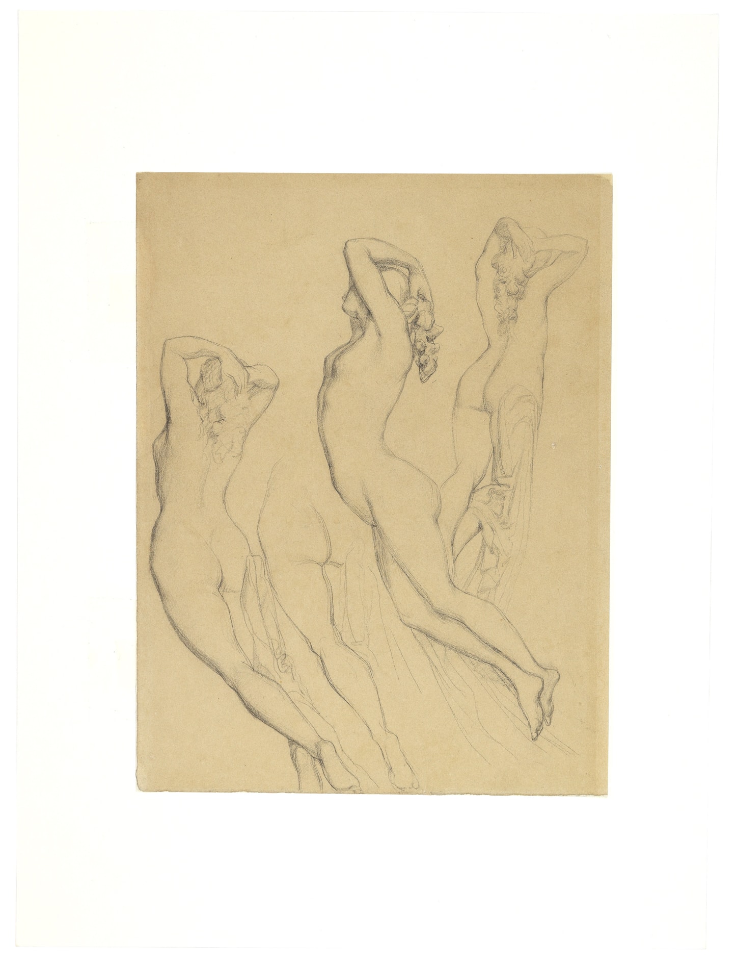 This drawing gives some idea of the care with which Lehmann prepared his compositions, and shows the artist working out the pose of the central oceanid in the final painting. He would produce many individual studies for each of the figures in his paintings, often studying the pose first with a nude model – a legacy of his training with Ingres - before adding clothing to the figure. Two more finished studies for the same floating nymph, drawn in black, red and white chalk, are in the Musée des Beaux-Arts in Orléans.