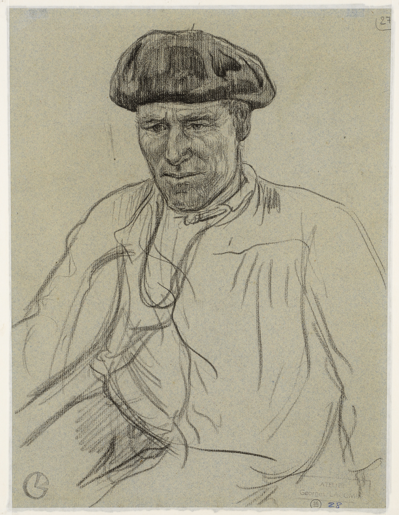 The drawing on the verso of the present sheet is a portrait of a Breton sailor named Piriou, who helped Lacombe sail the Greska, the boat which the artist kept at Camaret. Lacombe produced a number of drawings of Piriou, whose wife and daughter were also the subject of drawings that were originally in the same Breton sketchbook as the present sheet. This sketchbook was made up of sheets of blue paper, with most of the drawings datable to 1895 and depicting Breton subjects. Several drawings were removed from this sketchbook in the 1970s, of which the present sheet is one, and the remainder of the now-unbound Breton sketchbook entered the collection of the Louvre in 1983.