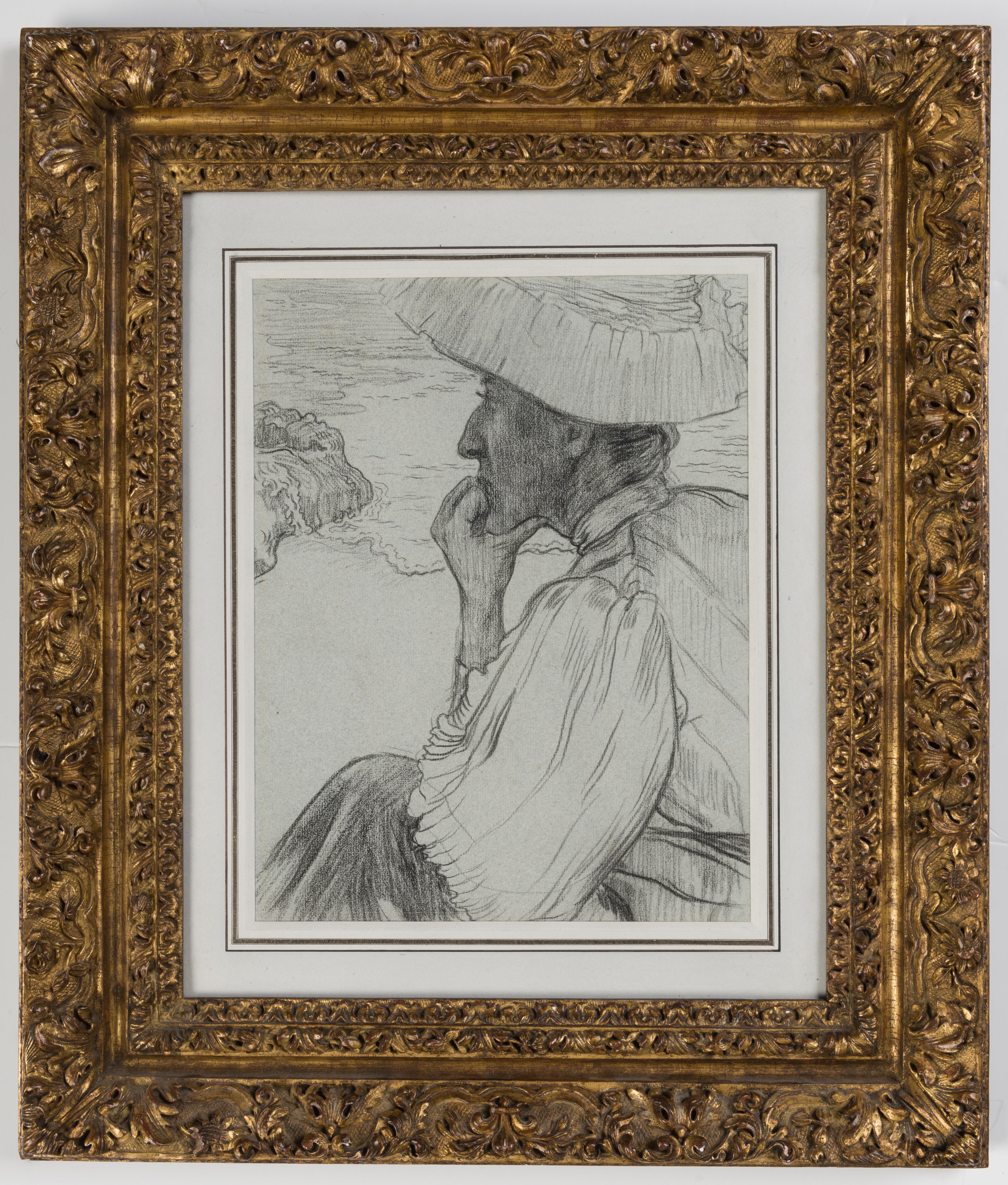This drawing depicts Gabrielle Wenger, née Questroy (1854-1944), the mother of the artist’s future wife Marthe, seated on the cliffs above Camaret-sur-Mer, on the Crozon peninsula overlooking the sea. When Lacombe made this drawing in 1895, Gabrielle was a widow; her first husband Adolphe Wenger had died two years earlier. Gabrielle Wenger shared with Lacombe an interest in music; she hosted musical soirées and concerts at her home in Versailles, which the artist regularly attended, and was herself a talented pianist. She was also one of Lacombe’s patrons, commissioning from him a series of decorative wall paintings for her house in Versailles in 1893. Lacombe made several drawings of Gabrielle Wenger; one such example, drawn in coloured chalks and probably executed a year earlier than the present sheet, is in a private collection. A large, full-length pastel portrait of Mme. Wenger seated at a piano, dated 1896, is in the collection of the Musée Lambinet in Versailles.