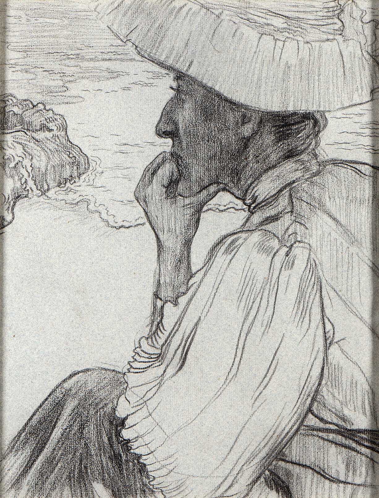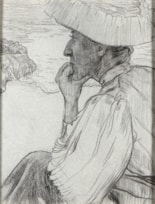 This drawing depicts Gabrielle Wenger, née Questroy (1854-1944), the mother of the artist’s future wife Marthe, seated on the cliffs above Camaret-sur-Mer, on the Crozon peninsula overlooking the sea. When Lacombe made this drawing in 1895, Gabrielle was a widow; her first husband Adolphe Wenger had died two years earlier. Gabrielle Wenger shared with Lacombe an interest in music; she hosted musical soirées and concerts at her home in Versailles, which the artist regularly attended, and was herself a talented pianist. She was also one of Lacombe’s patrons, commissioning from him a series of decorative wall paintings for her house in Versailles in 1893. Lacombe made several drawings of Gabrielle Wenger; one such example, drawn in coloured chalks and probably executed a year earlier than the present sheet, is in a private collection. A large, full-length pastel portrait of Mme. Wenger seated at a piano, dated 1896, is in the collection of the Musée Lambinet in Versailles.