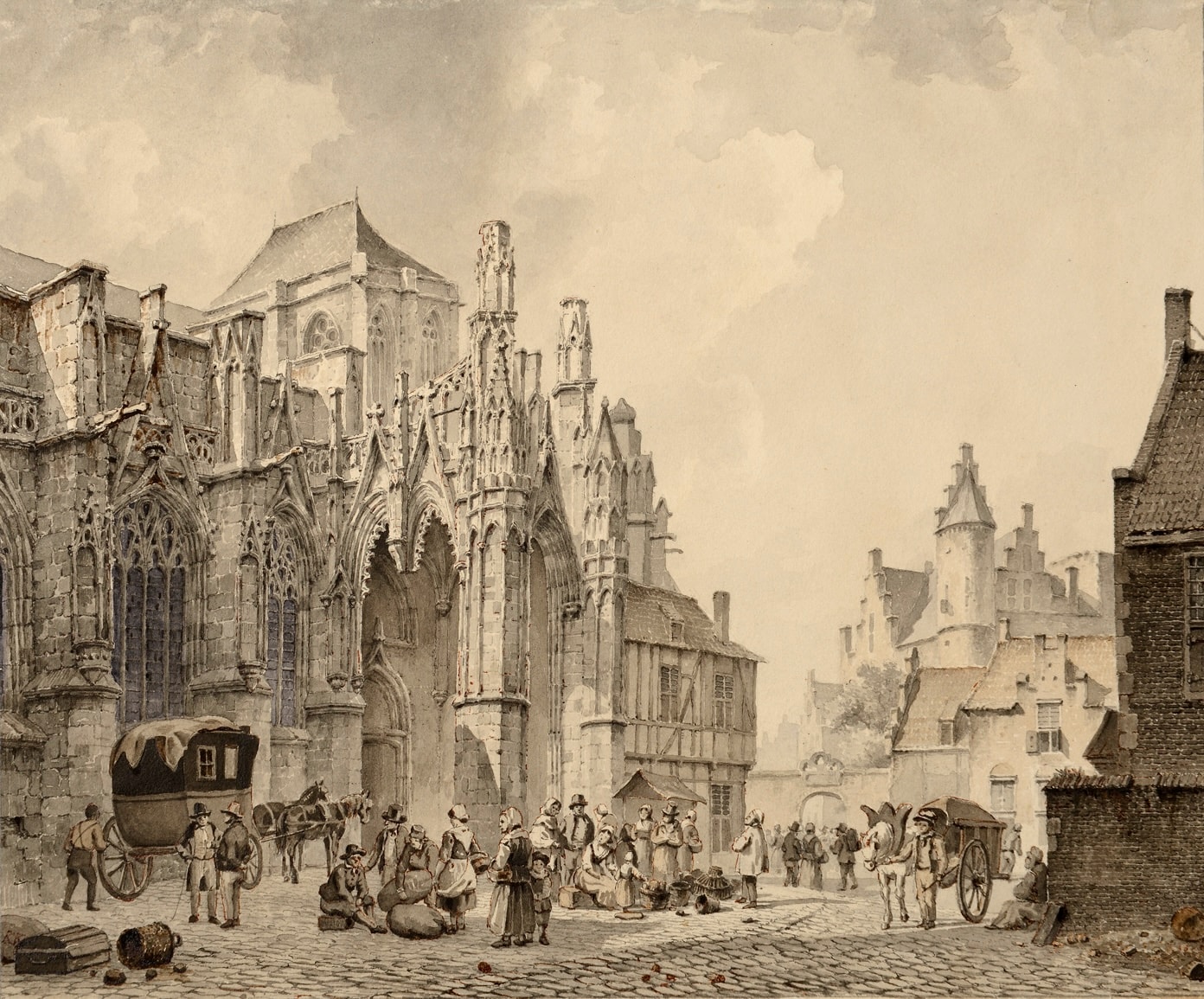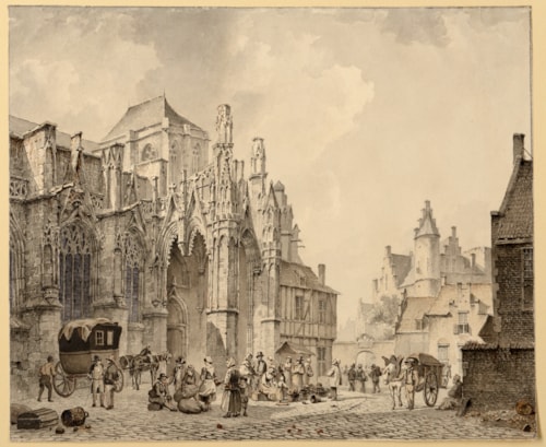 Although many of Karsen’s urban views are difficult to locate, and indeed many depict generic towns and cities, this church in this view may be identified as Notre-Dame de Louviers, in the town of Louviers in Normandy. Shown in this drawing is the south facade and porch of the church, built between 1496 and 1510, and regarded today as among the finest examples of the Flamboyant style of Late Gothic architecture in France.