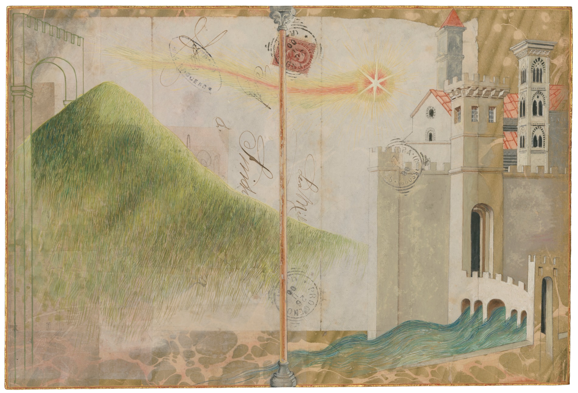 Collage, gold leaf, gouache, graphite and silverpoint on paper mounted on panel