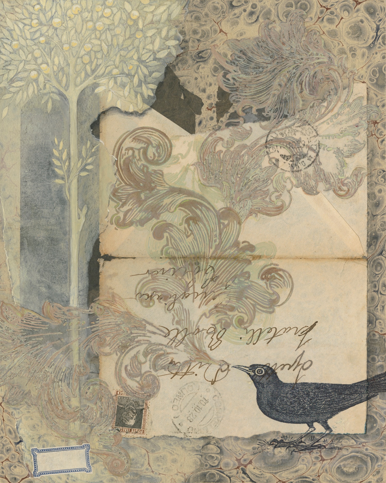 So stunning is the skill with which Connell executes the fabric’s drape and spray of pearls, so far removed is this mastery of technique from anything we encounter in our daily lives, that it takes some time to be able to recognize that the real genius is in the composition. This is one of the deepest pleasures of the work, that every level of it stuns us into stillness. We must absorb the way she paints before we can begin to take in what it is she’s painted - the stack of dice which nearly vanish in the painting’s corner, white against white; the elegant sprawl of a signature across an opened envelope; the juniper trees peeking in through an ornate opening in a wall, the light of heaven behind them. The images interrelate like tarot cards, their combined elements spelling out a message we can’t quite read but which continually draws us in.