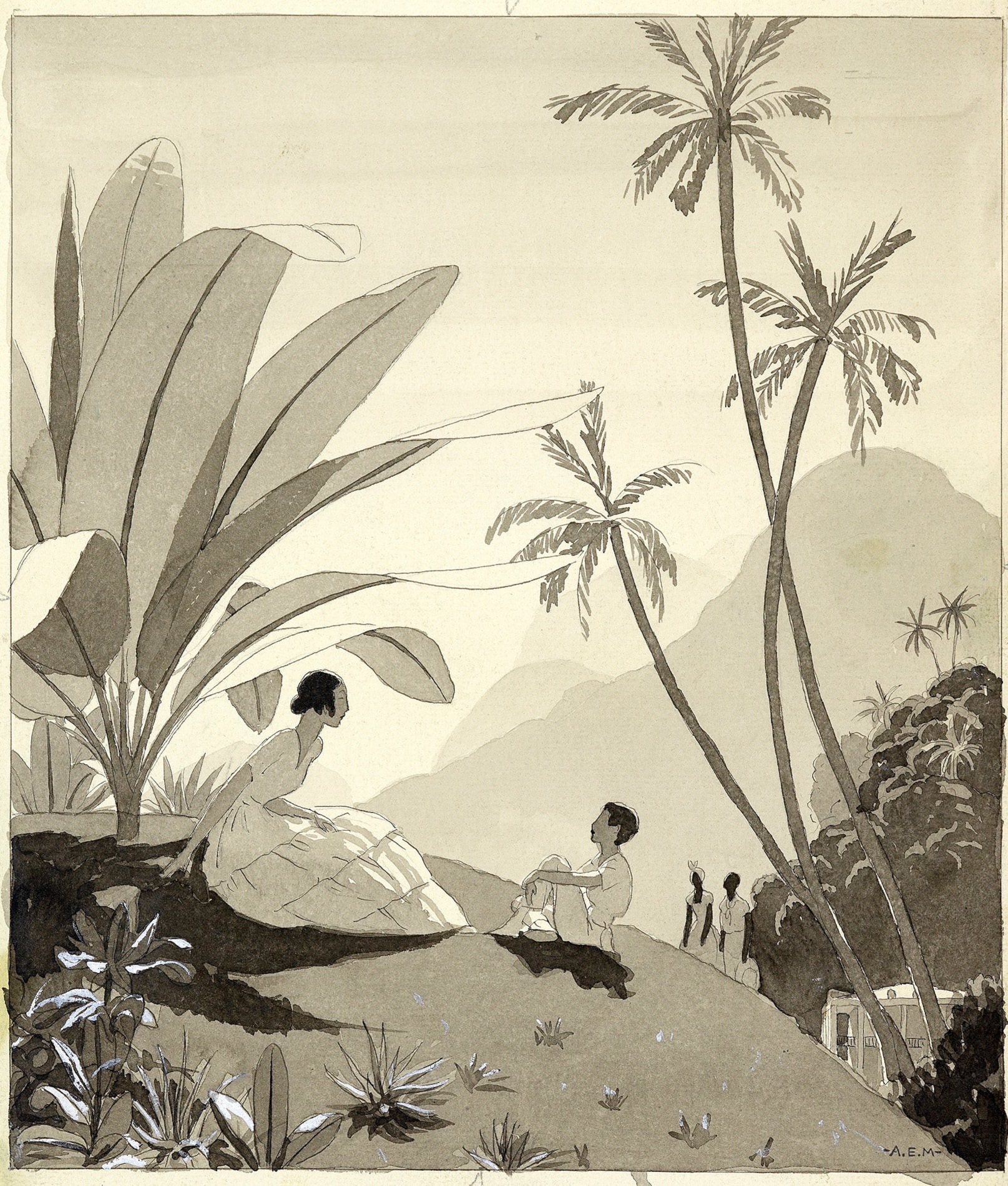 After the First World War Marty continued to provide illustrations for the Gazette du Bon Ton, as well as for Vogue, Femina, L’Illustration des Modes, Monsieur, Harper’s Bazar, Le Sourire and House and Garden, among others. He also illustrated around fifty books, most notably Henri de Regnier’s Scènes Mythologiques, published in 1924, and produced designs for posters for London Transport. Working with the Compagnie des Arts Français, established by the architect Louis Süe and the decorator André Mare, Marty contributed to the decoration of the Pavillon Fontaine at the seminal Exposition des Arts Décoratifs of 1925, for which he also served on the jury. Twelve years later, at the Exposition Internationale of 1937, Marty again worked alongside Süe on the decoration of the jardin d’hiver of the Pavillon de la Société des Artistes Décorateurs, painting four wall panels devoted to the subjects of Pole Vaulting, Horseback Riding, Basketball and Tennis.