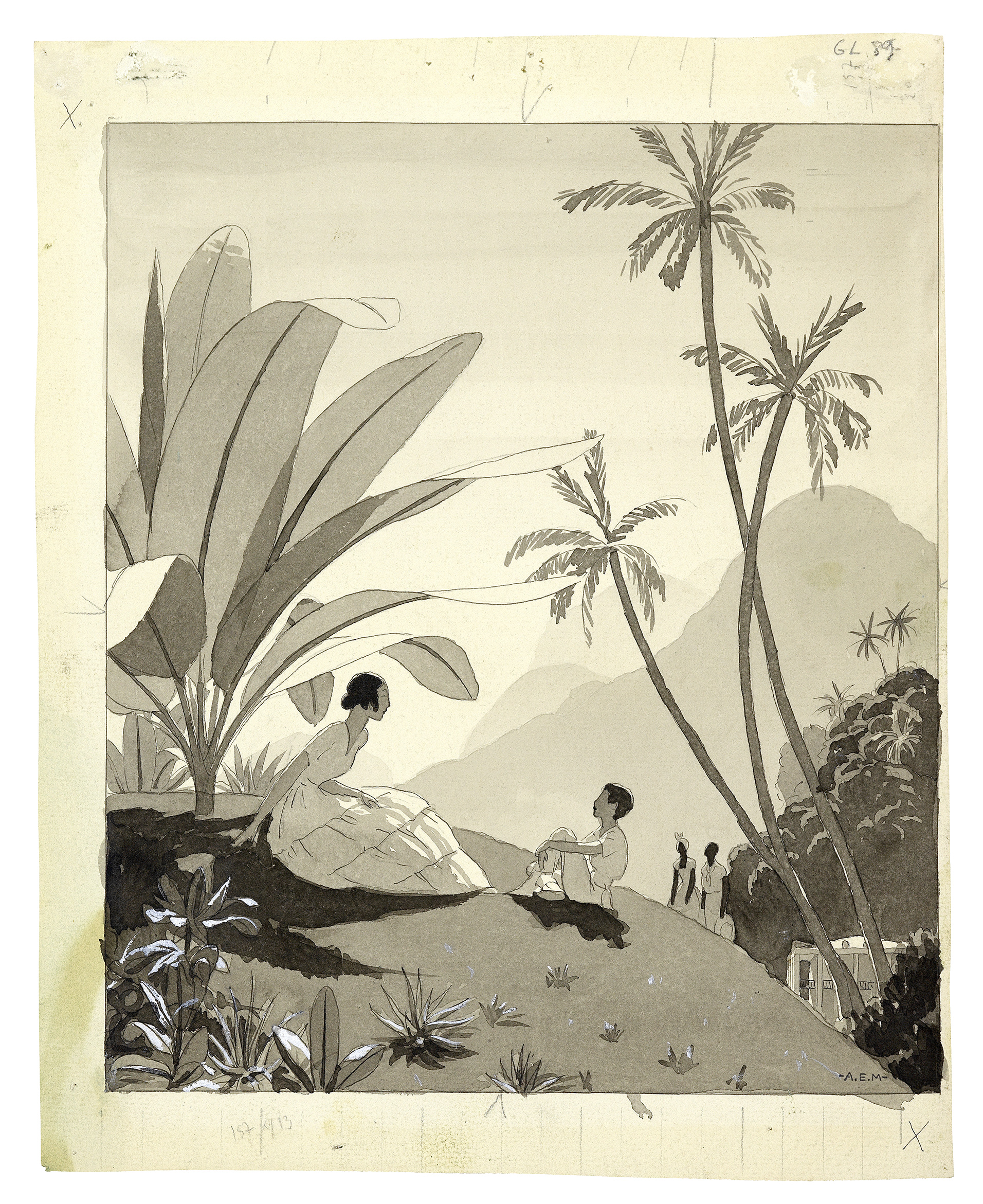 After the First World War Marty continued to provide illustrations for the Gazette du Bon Ton, as well as for Vogue, Femina, L’Illustration des Modes, Monsieur, Harper’s Bazar, Le Sourire and House and Garden, among others. He also illustrated around fifty books, most notably Henri de Regnier’s Scènes Mythologiques, published in 1924, and produced designs for posters for London Transport. Working with the Compagnie des Arts Français, established by the architect Louis Süe and the decorator André Mare, Marty contributed to the decoration of the Pavillon Fontaine at the seminal Exposition des Arts Décoratifs of 1925, for which he also served on the jury. Twelve years later, at the Exposition Internationale of 1937, Marty again worked alongside Süe on the decoration of the jardin d’hiver of the Pavillon de la Société des Artistes Décorateurs, painting four wall panels devoted to the subjects of Pole Vaulting, Horseback Riding, Basketball and Tennis.