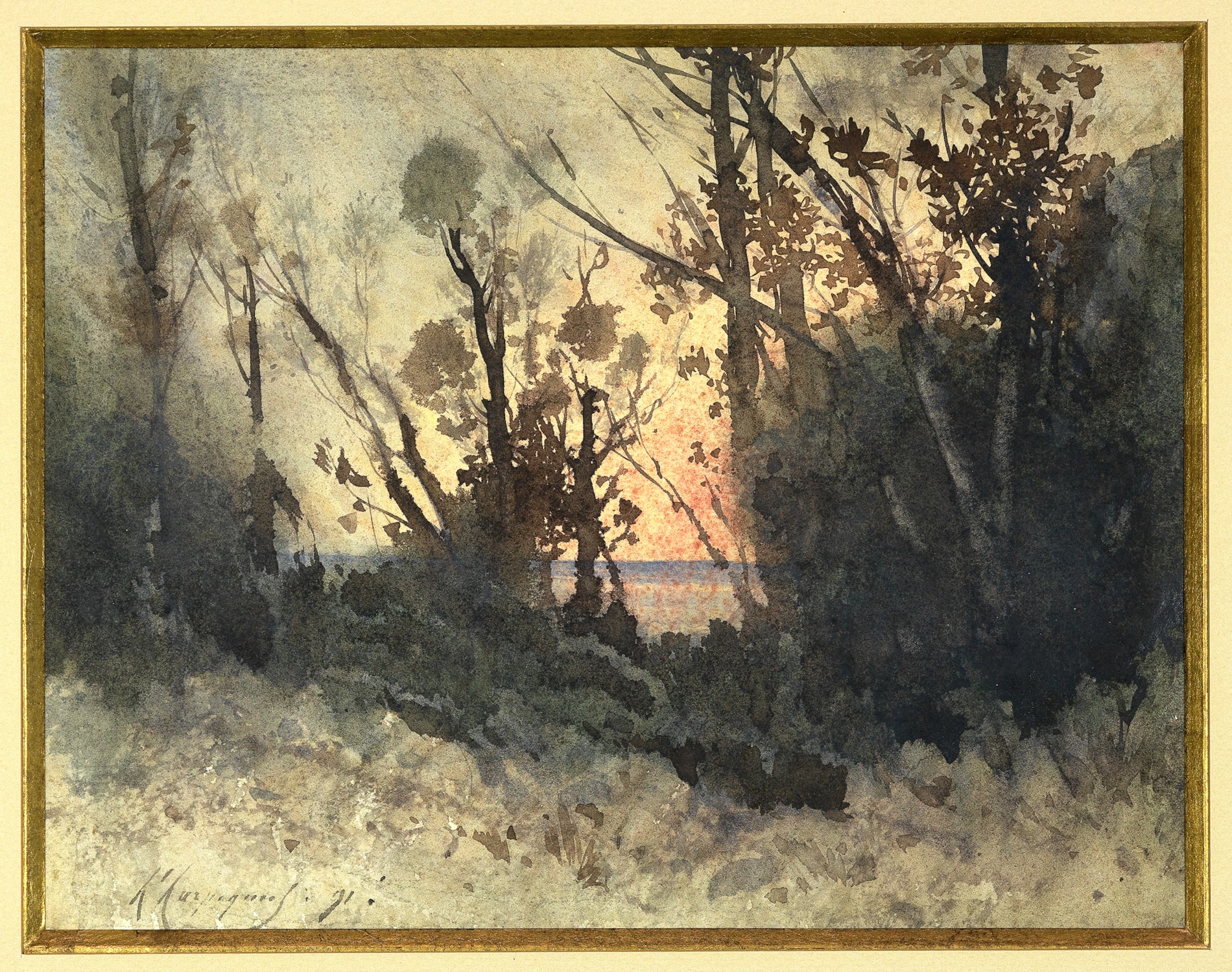 Henri-Joseph Harpignies began drawing at the age of four or five, according to an unpublished autobiographical manuscript. He came to realize his vocation as an artist at a relatively late age, however, and it was not until 1848, when he was in his late twenties, that he decided to abandon a career as a travelling salesman and begin training as an artist in the studio of the landscape painter Jean-Alexis Achard. Harpignies made his Salon debut in 1853, exhibiting views of Capri and Valenciennes, and he continued to show regularly at the Salons throughout his very long and productive career, until 1912. His luminous landscape paintings, depicting both rural and urban views, were inspired by his first meetings with Camille Corot in the early 1850’s. (Indeed Corot, whom Harpignies idolized, purchased two of the young artist’s watercolours in order to encourage him in his work.) In 1863 three of his entries to the Salon were rejected, and were instead shown at the Salon des Refusés. The same year he made his second visit to Italy, living in Rome and Capri and remaining there until 1865; this sojourn was also to have a significant effect on his later work. From 1883 onwards began to sell his work through the art dealers Arnold & Tripp, from whom he also received commissions which earned the artist some 70,000 francs per year, on average. This arrangement afforded the artist a level of financial security, and led to an increase in his output.