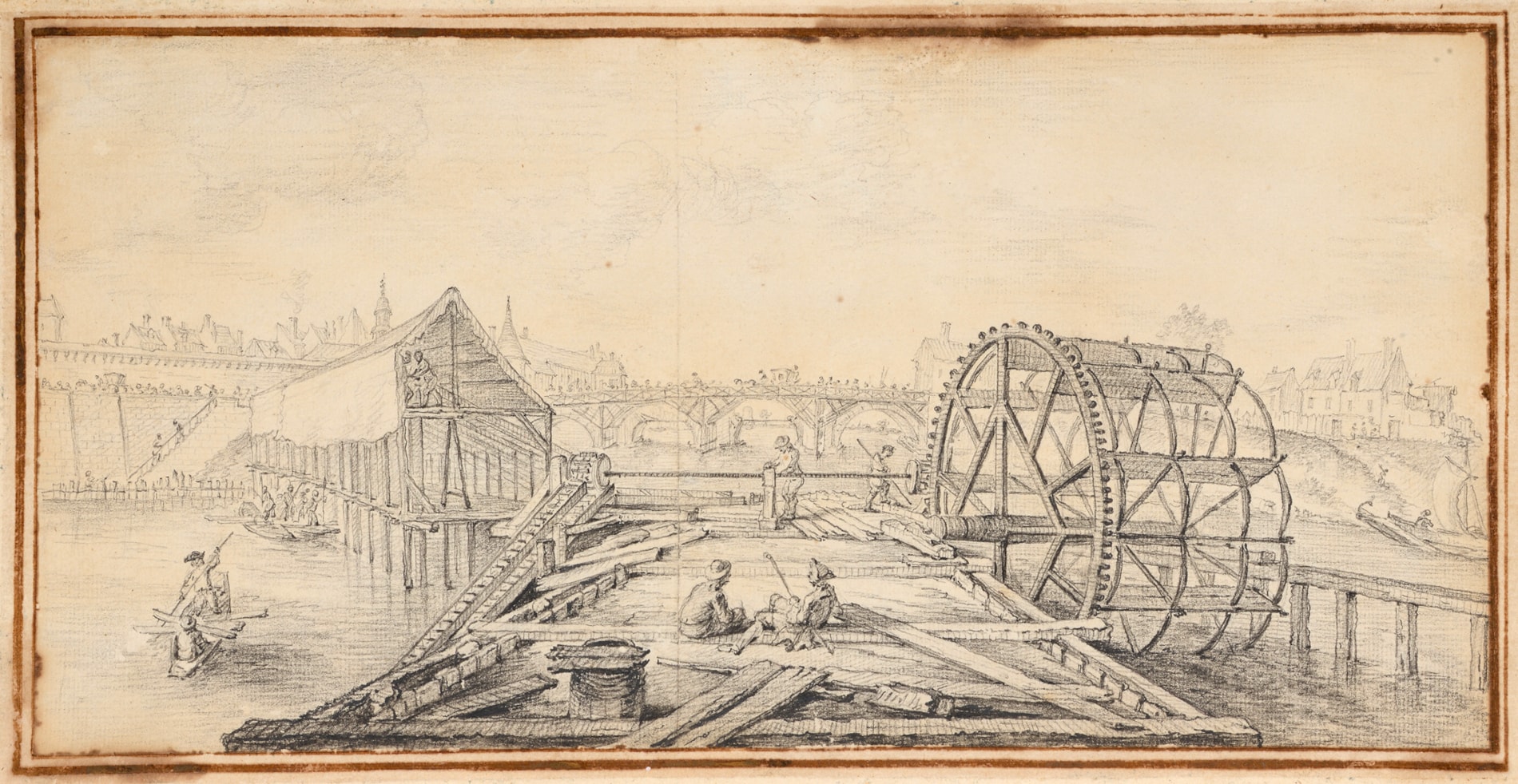 As Desfriches’s great-grandson and biographer Paul Ratouis de Limay, a previous owner of this drawing, noted, ‘the ingénieur des ponts et chaussées Soyer was charged with the construction of the Pont d'Orleans...he is celebrated and Desfriches soon counts him among his best friends...Wishing to please his new friend, Desfriches drew, between 1750 and 1760, several Views of the Construction of the Pont d'Orleans, animated by a host of little characters, which reveal a remarkable suppleness and a precision in the use of chalk.’