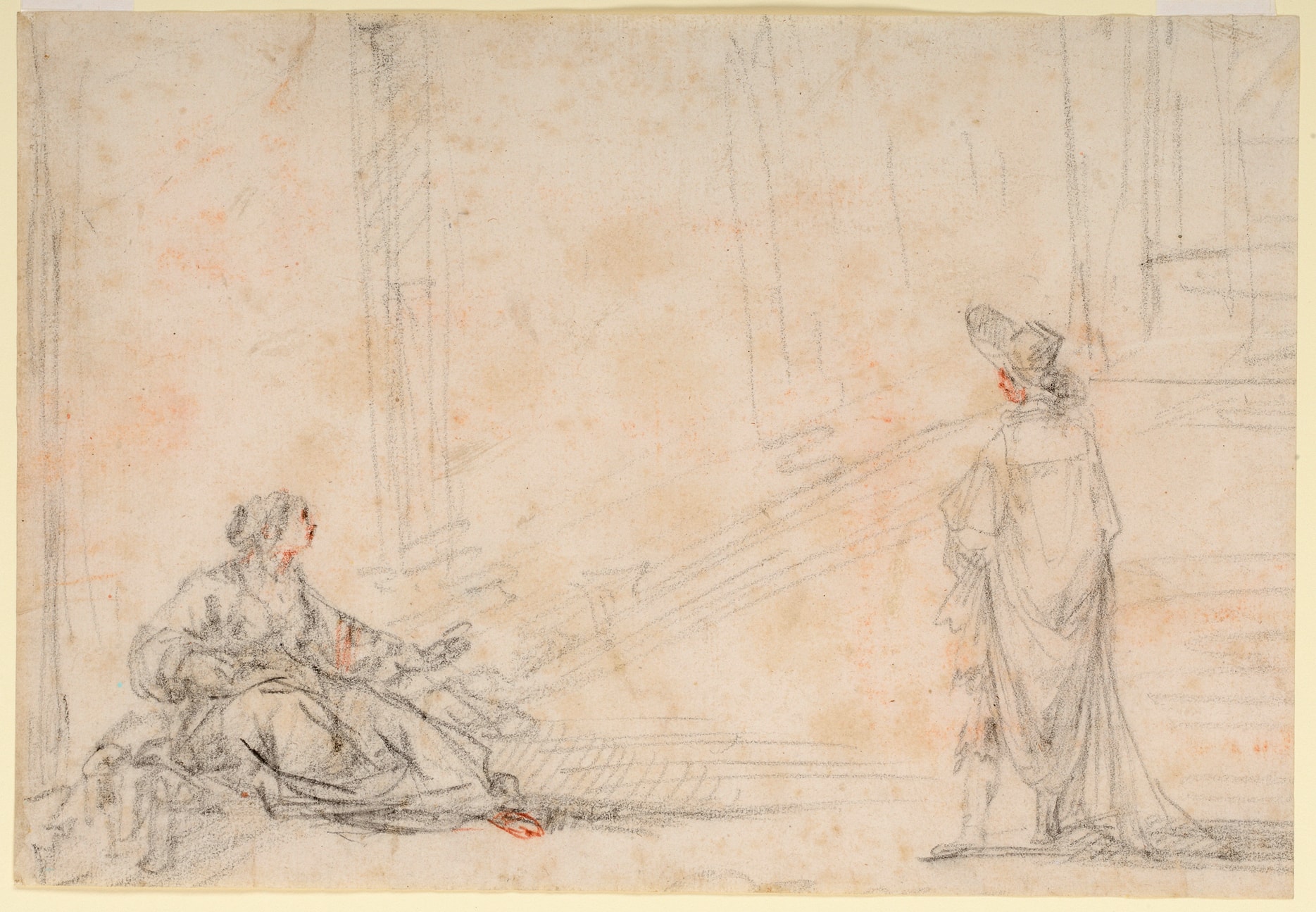 A black and red chalk study of a man wearing a similar wide-brimmed hat, albeit standing in reverse, was sold at auction in London in 1972.