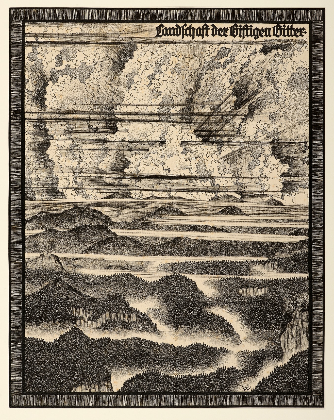 A German painter and graphic artist, Hermann Wöhler studied in his native Hanover, as well as in Dresden and Berlin. He was a pupil of the Symbolist artist and illustrator Hugo Hoeppener, known as Fidus (1868-1948), whose work combined mysticism, eroticism and allegory, and was a direct influence on the psychedelic art of the 1960s. From the start of his career, Wöhler, like Fidus, took his subjects from mythology and literature, creating striking works characterized by bizarre imagery and imaginative compositions. At the beginning of his career Wöhler worked primarily in black and white, producing elaborate large-scale drawings in pen and ink. In 1918 he produced a portfolio of seven large ink compositions, plus a title page, under the title Zwielicht: Sieben Sinnbilder / Erste Geschichte des Erwachenden Schicksals vor dem Licht (Twilight: Seven Symbols / The First History of the Awakening Fate of Light), and he continued to create several series of sizeable ink drawings throughout the 1920s, as well as a few lithographs. A deeply intellectual man, Wöhler was well-versed in history and art history, philosophy and classical literature, as well as in Oriental and Eastern religions, Gnosticism and the Kabbalah.