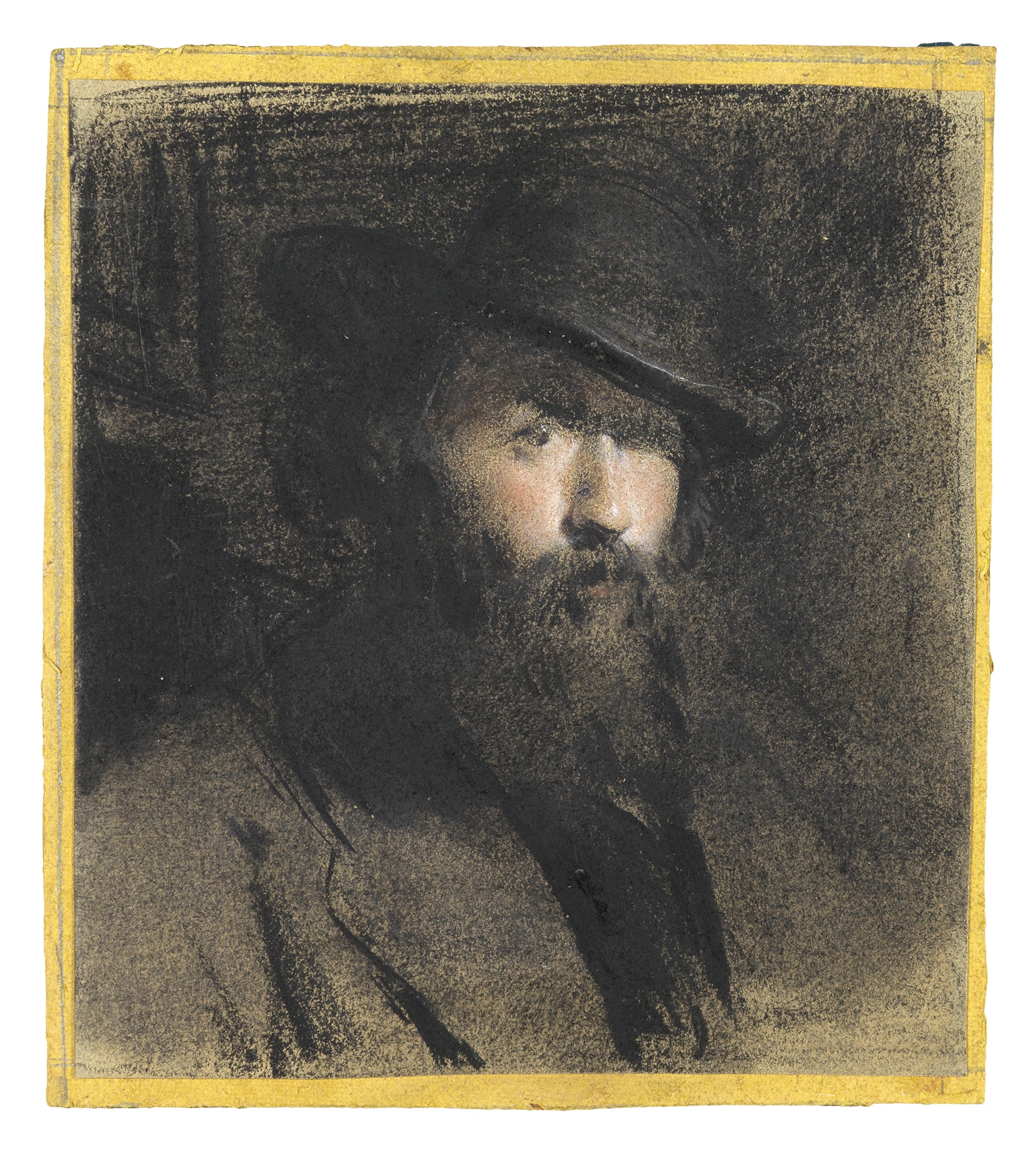 Antoine Vollon seems to have preferred this three-quarter pose, with part of his face in deep shadow, in the handful of self-portraits by the artist that have survived. These include paintings of c.1860 in a private collection and of c.1870 in the Musée d’Orsay in Paris, as well as a self-portrait in old age in 1889. The jaunty tilt of the hat in this drawing may also be a reference to the artist’s usual appearance. As has been noted of Vollon, ‘before leaving Lyon he had been cautioned that once in Paris, he should try to behave like everyone else and not wear his soft cap over one ear. He claimed never to have obeyed this advice. Indeed, in an early Rembrandtesque self portrait, Vollon, then newly arrived in Paris, portrayed himself, palette in hand, wearing his cap to one side.’
