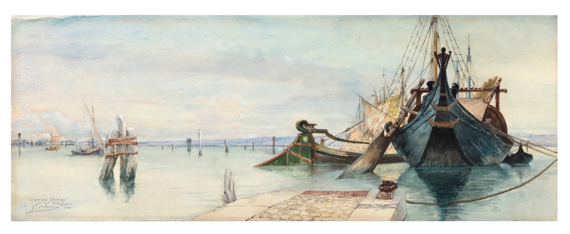 Georges Clairin painted a number of paintings and watercolours set in Venice, mostly of elegant genre scenes and festival subjects. The present sheet was drawn in June 1891, when the artist was in Venice as a guest of Princess Edmond de Polignac. A similar large watercolour view of boats on a quay in Venice, dated 1892 and dedicated to Charles Garnier, the architect of the Opéra, was on the art market in France in 2004 and 2012. Also similar is a large, frieze-like watercolour and gouache drawing of The Port of London, dated 1898, that appeared at auction in Paris in 2009 and 2012.