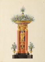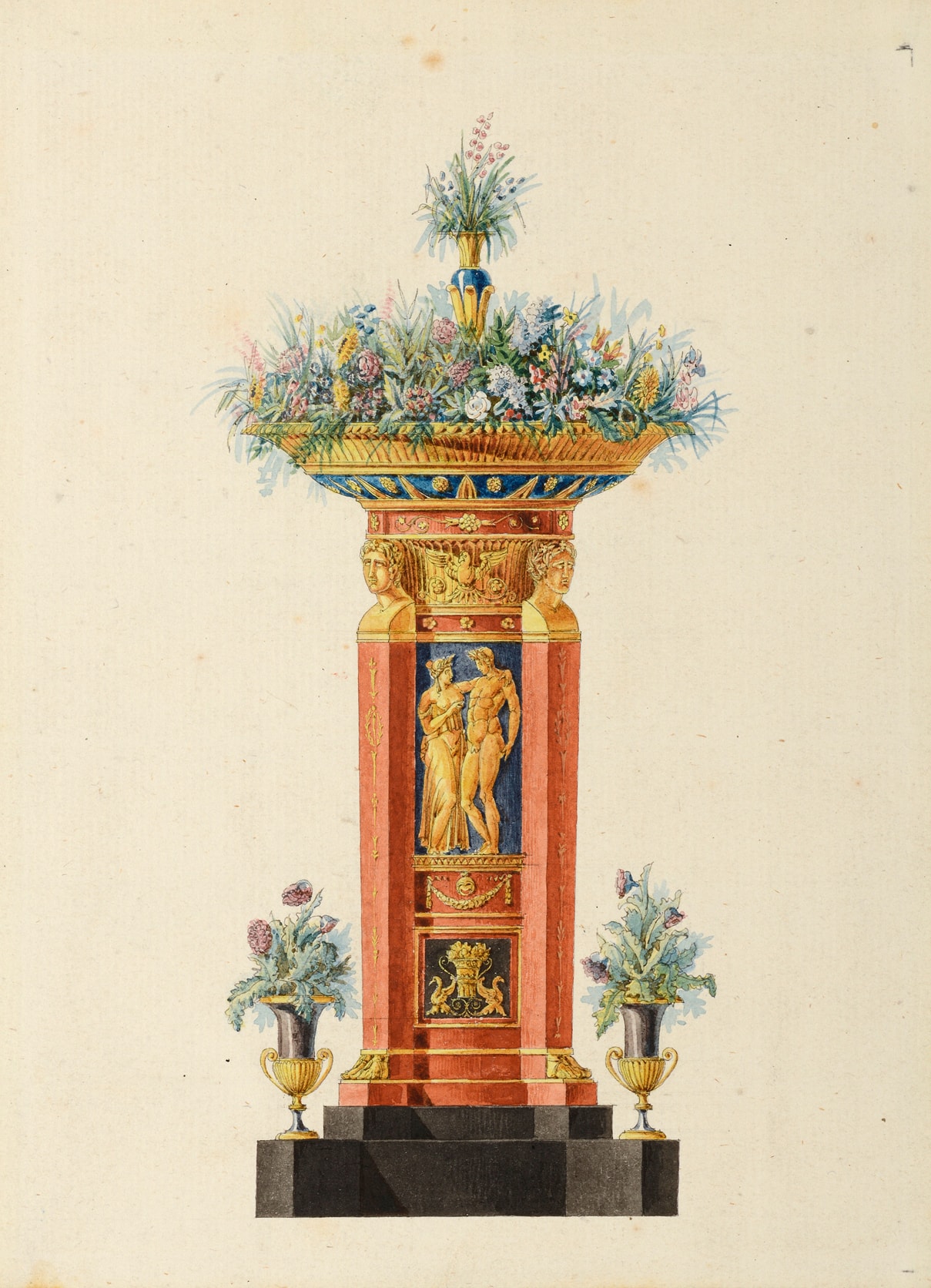 This watercolour by Percier was formerly in the archival collection of cabinetmaker François-Honoré-Georges Jacob-Desmalter (1770-1841), who oversaw one of the most important furniture workshops in Paris in the first quarter of the 19th century. A similar jardinière was produced by Jacob-Desmalter, after a design by Alexandre Dufour, for the Princesse d’Eckmülh at the Château de Savigny.