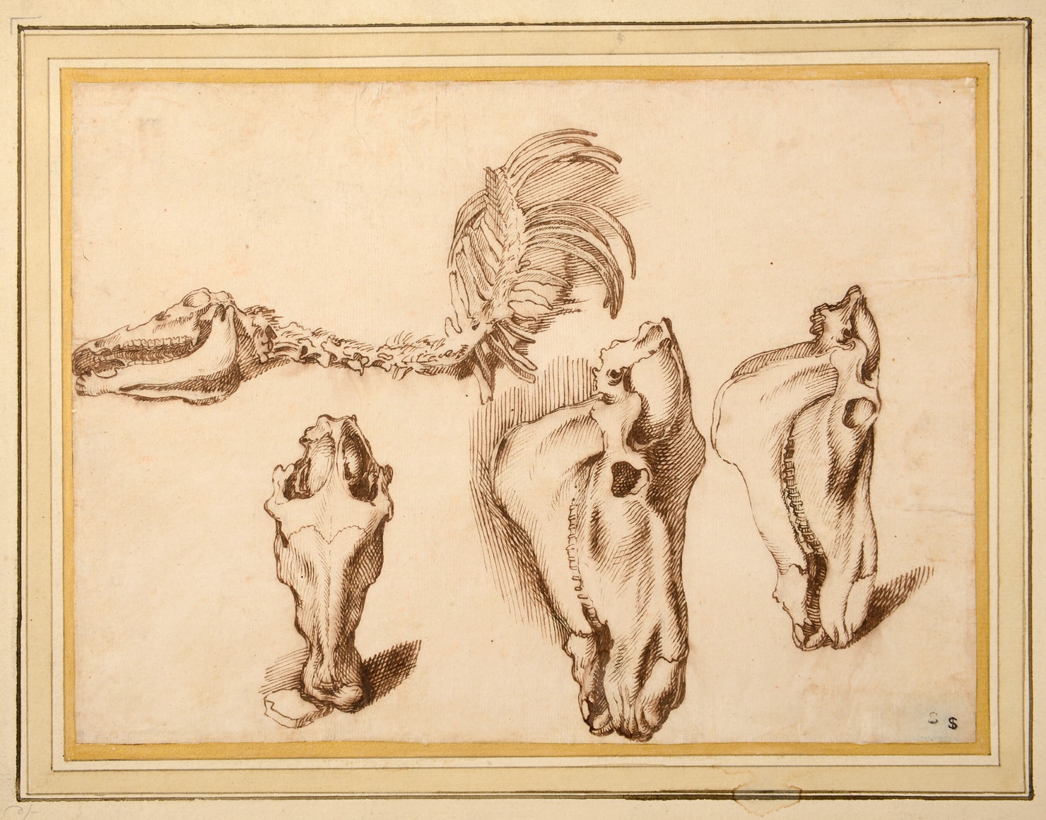 Only a handful of preparatory drawings by Napoletano for the Incisioni di diversi scheletri di animali are known, however, including a drawing of the skeleton of a horse, in the Biblioteca Nazionale in Florence, and a study of a mouse skeleton in the Louvre. This sheet of studies of the skull and part of the skeleton of a horse reflects Napoletano’s close study of Johannes Faber’s collection of animal skeletons, and may also be tentatively related to his etching of the complete skeleton of a horse from the Incisioni di diversi scheletri di animali. Stylistically comparable pen and ink drawings of parts of animal skeletons by Napoletano are among the nearly one hundred drawings by the artist the Musée des Beaux-Arts in Lille, including a study of the skull of a pelican, a drawing of the skull of a pig or boar, and a sheet with two studies of the skull of a goat.