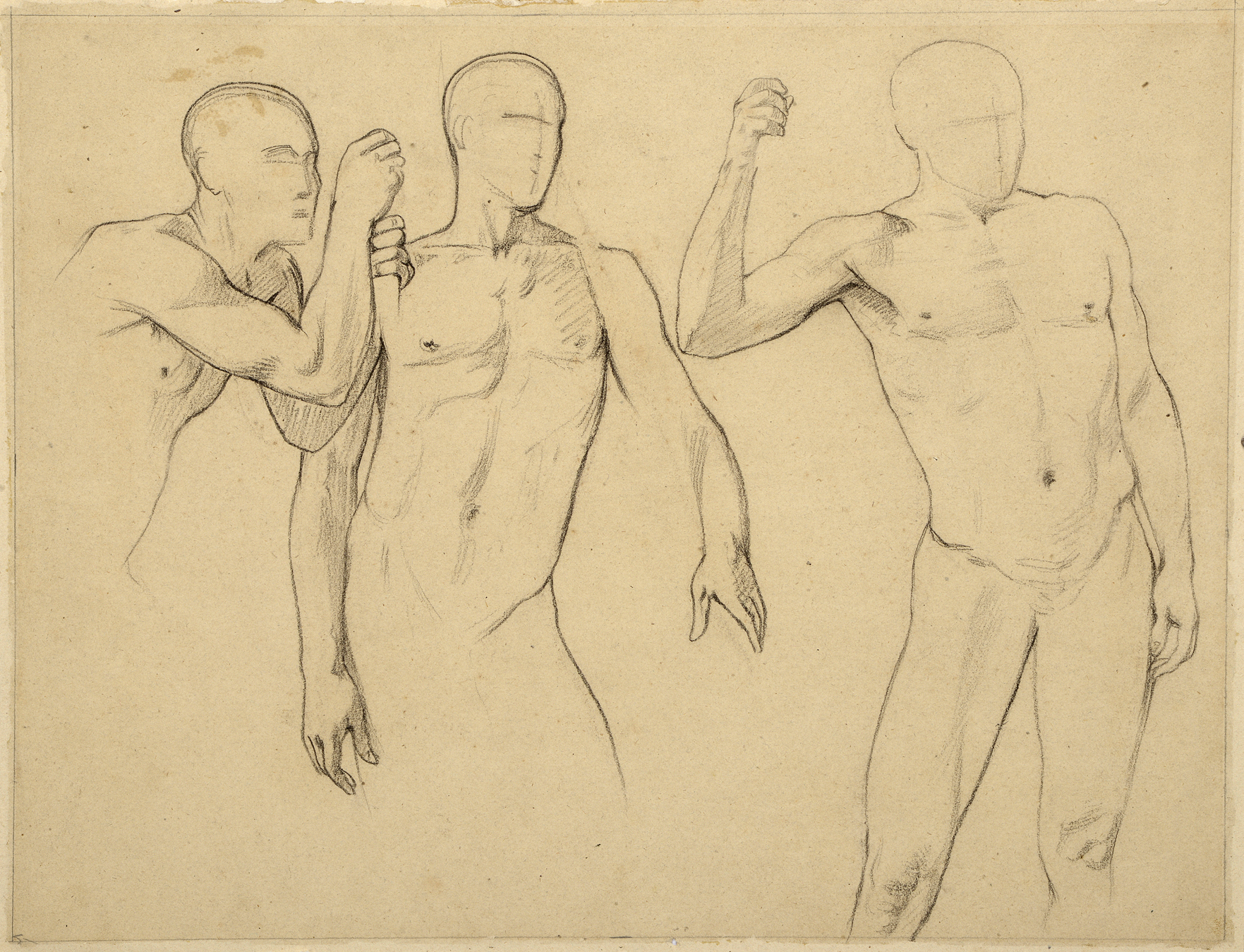 As Moser has suggested, some of the drapery studies in the present group of drawings, as well as the studies of male nudes - some of whom are holding staffs - may have served for either The Grand Chamberlain to Sesostris the Great or for other parts of the composition of the now-lost large painting of The Sad Father.
